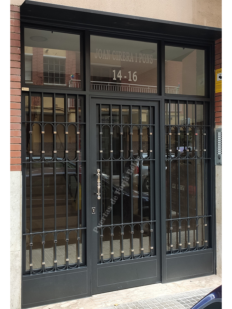 Puerta para comunidades de vecinos fabricada con hierro forjado de línea elegante entremezclando barrotes rectos con curvos. Puertas practicables para ventilación y limpieza cómoda.