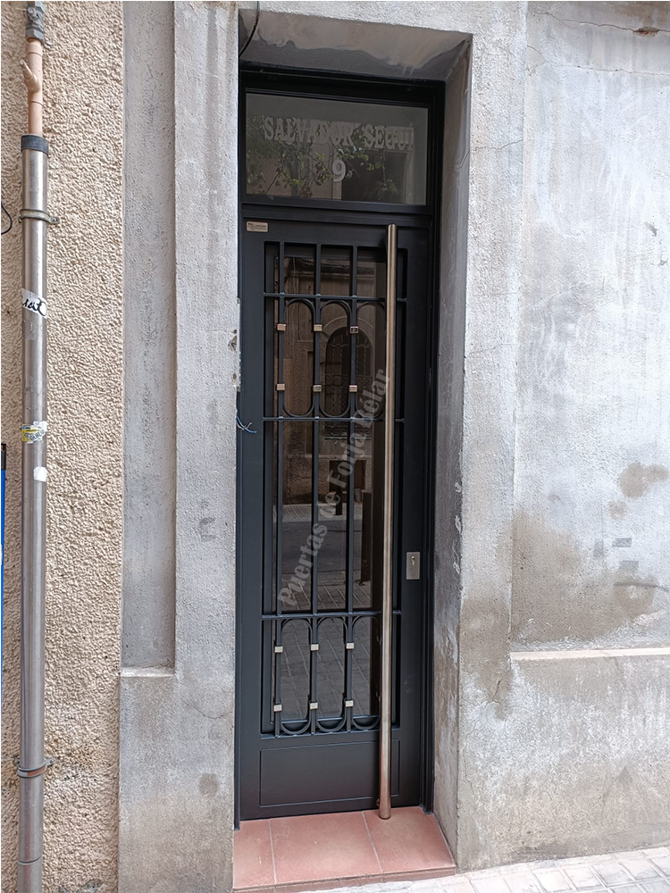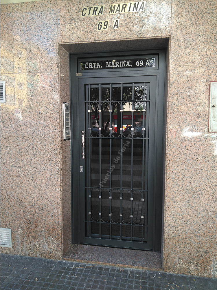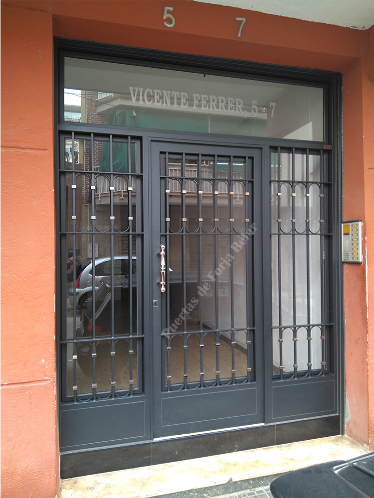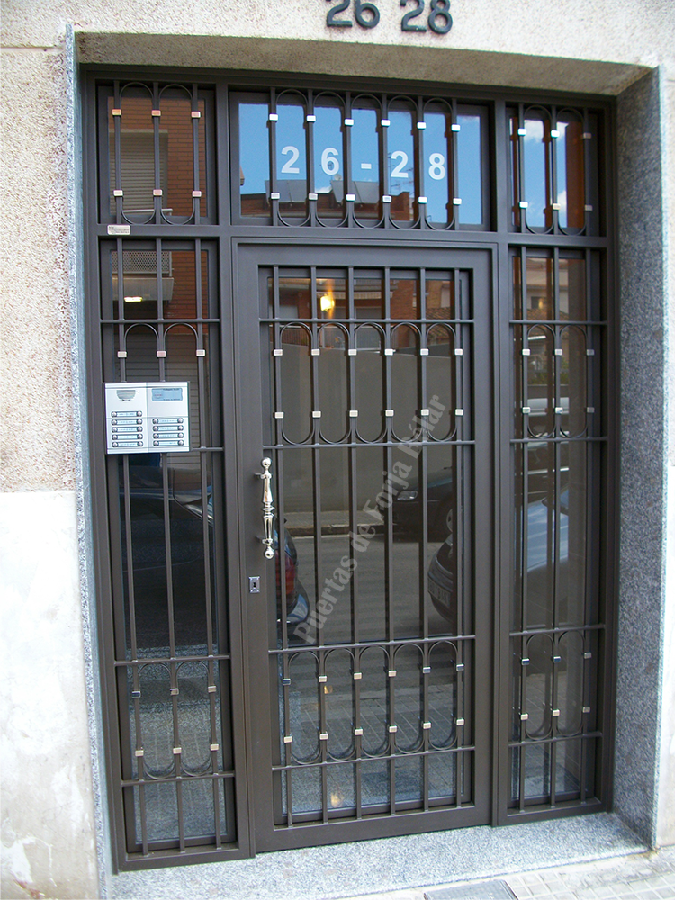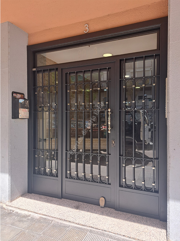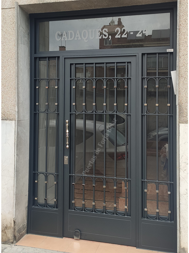 Puerta para comunidades de vecinos fabricada con hierro forjado de línea elegante entremezclando barrotes rectos con curvos. Puertas practicables para ventilación y limpieza cómoda.