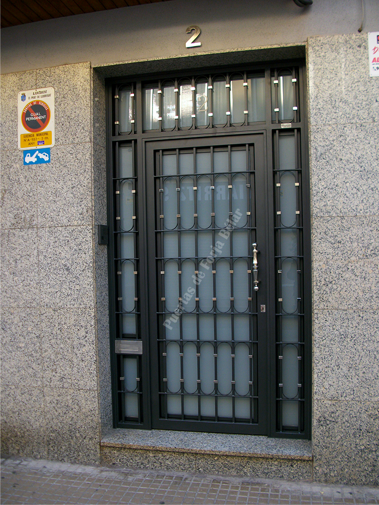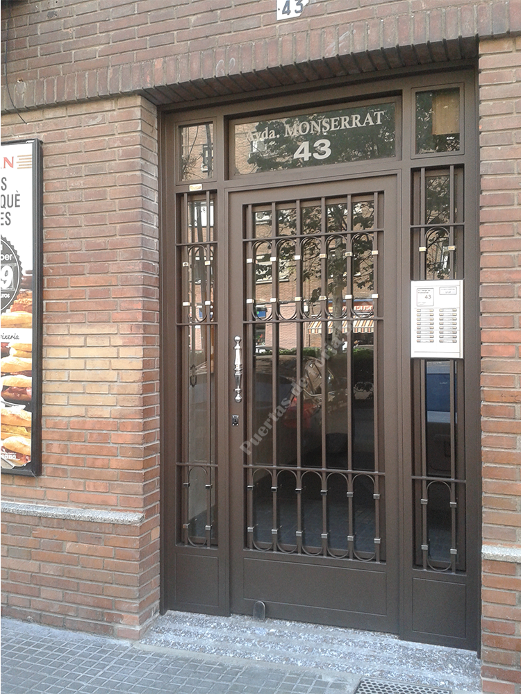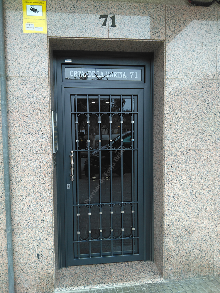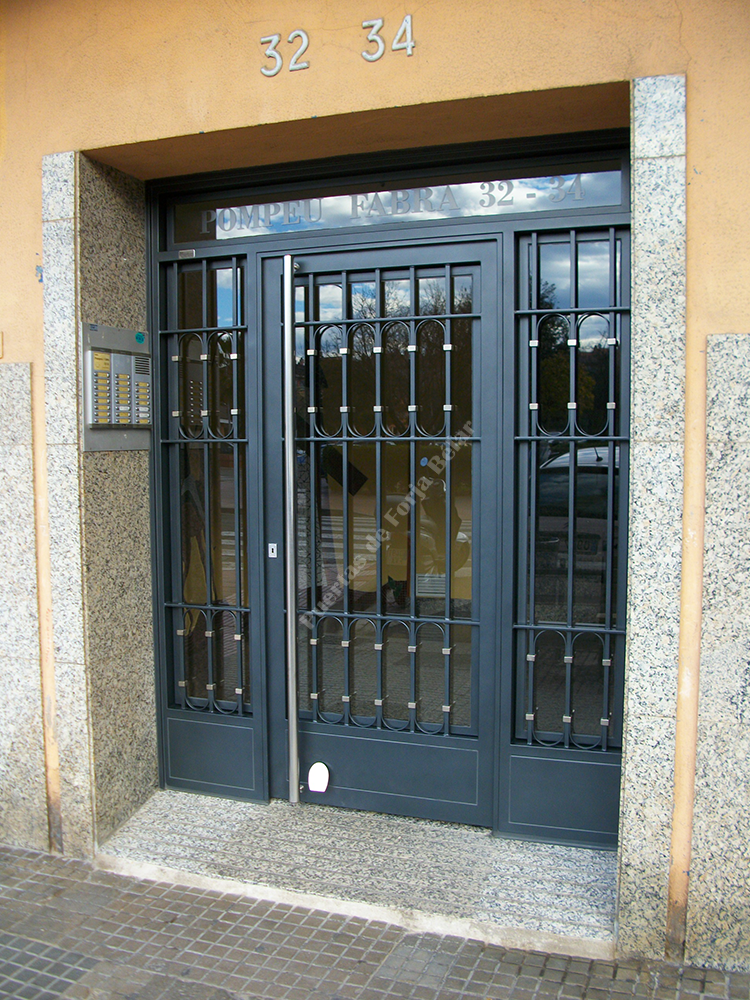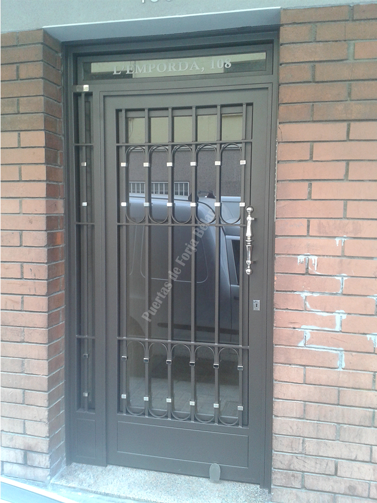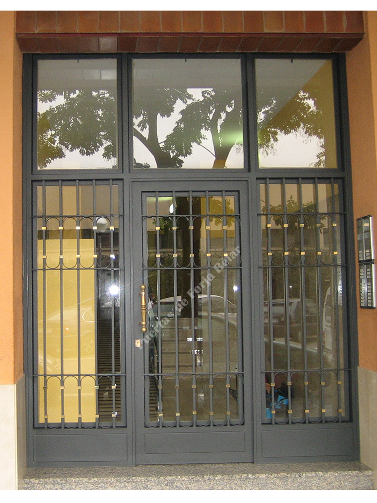 Puerta para comunidades de vecinos fabricada con hierro forjado de línea elegante entremezclando barrotes rectos con curvos. Puertas practicables para ventilación y limpieza cómoda.