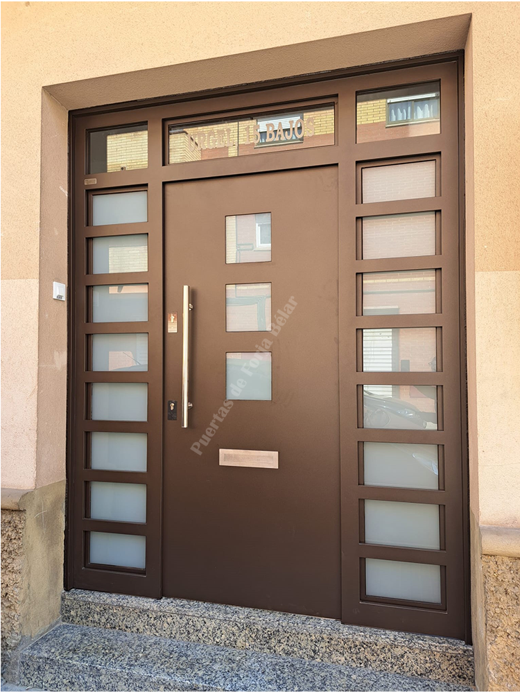 Puerta de comunidad y casas particulares de chapa lisa y recta con encajes cuadrados laterales de vidrio de seguridad para conseguir luminosidad interior.