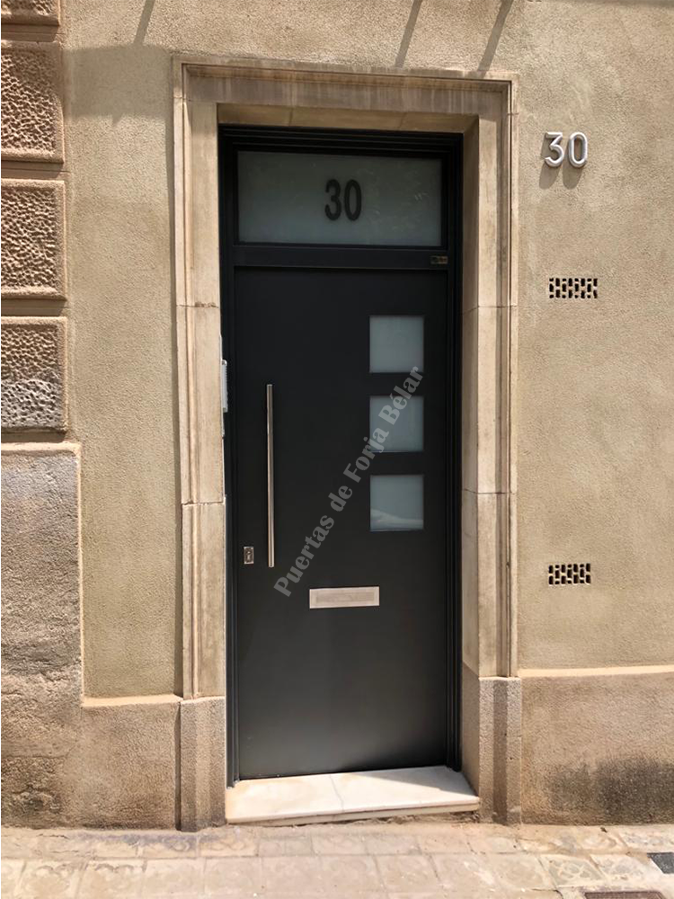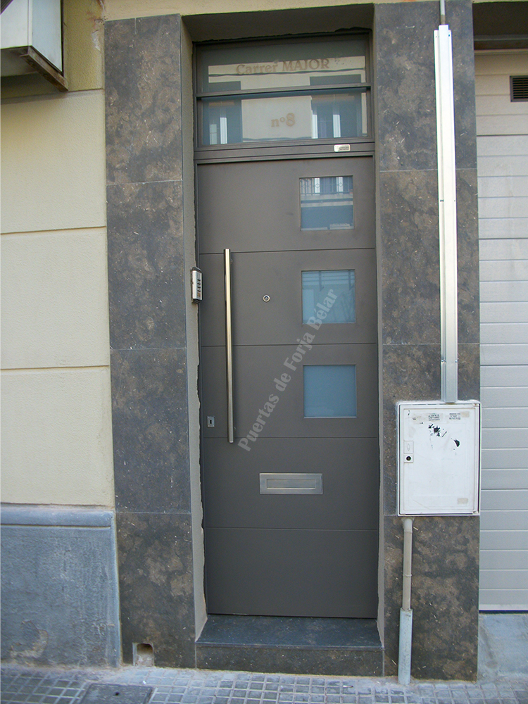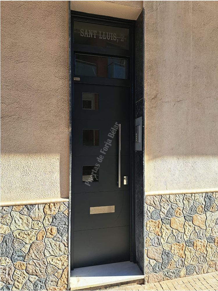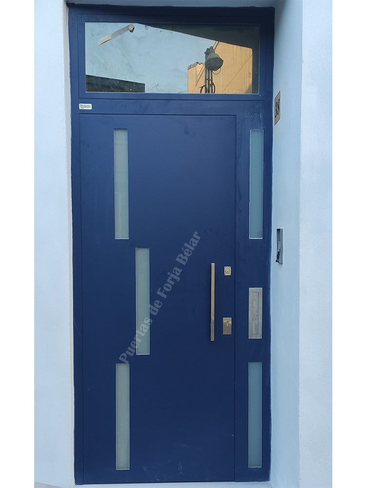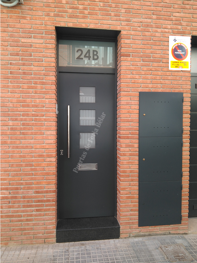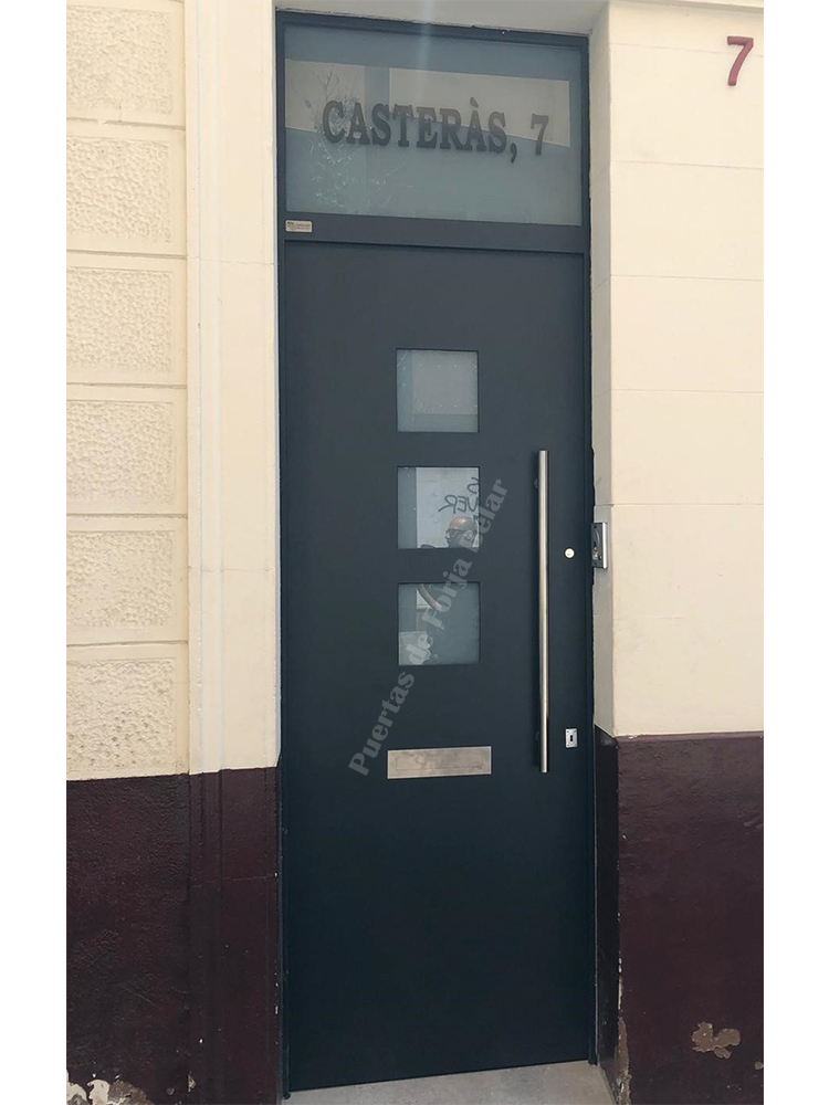 Puerta de comunidad y casas particulares de chapa lisa y recta con encajes cuadrados laterales de vidrio de seguridad para conseguir luminosidad interior.