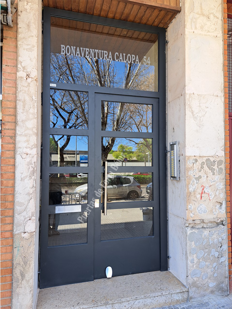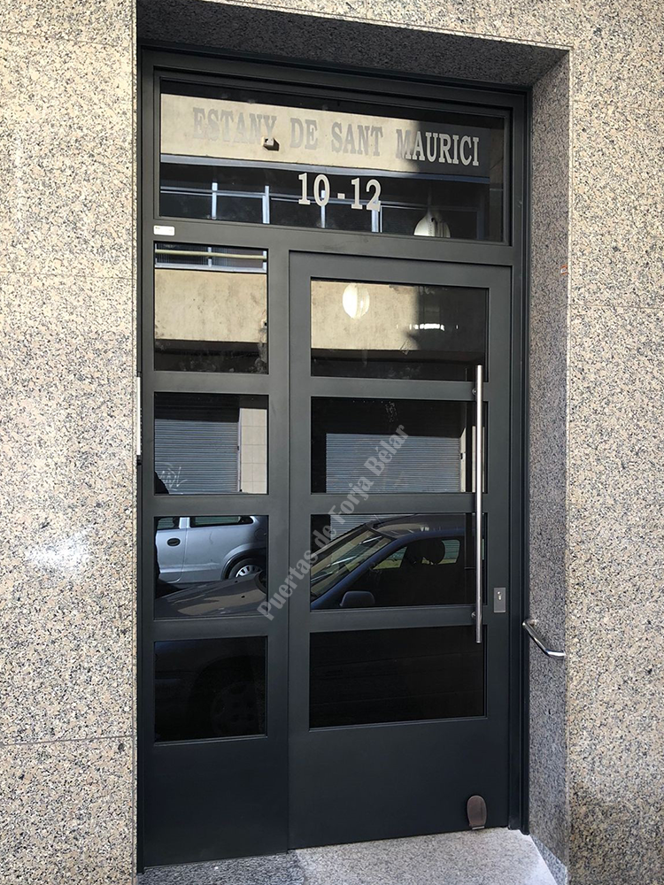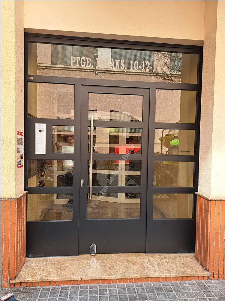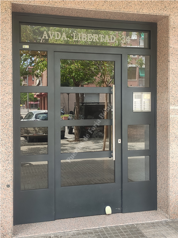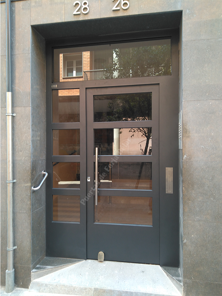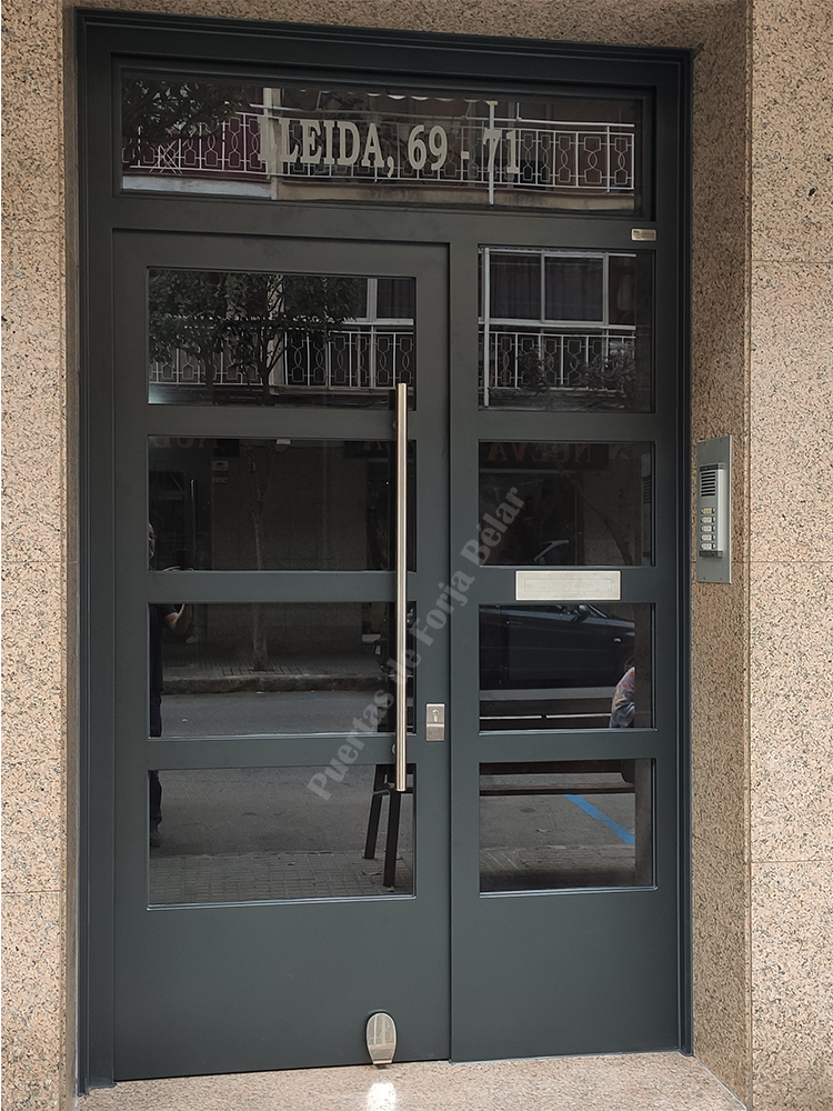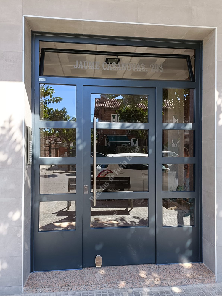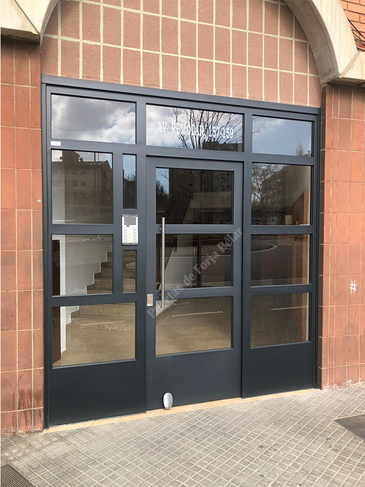 Puerta de comunidad de vecinos de estilo moderno, fabricada con hierro forjado que proporciona gran robustez y una elegancia exquisita. El acristalamiento proporciona mucha luminosidad al interior.