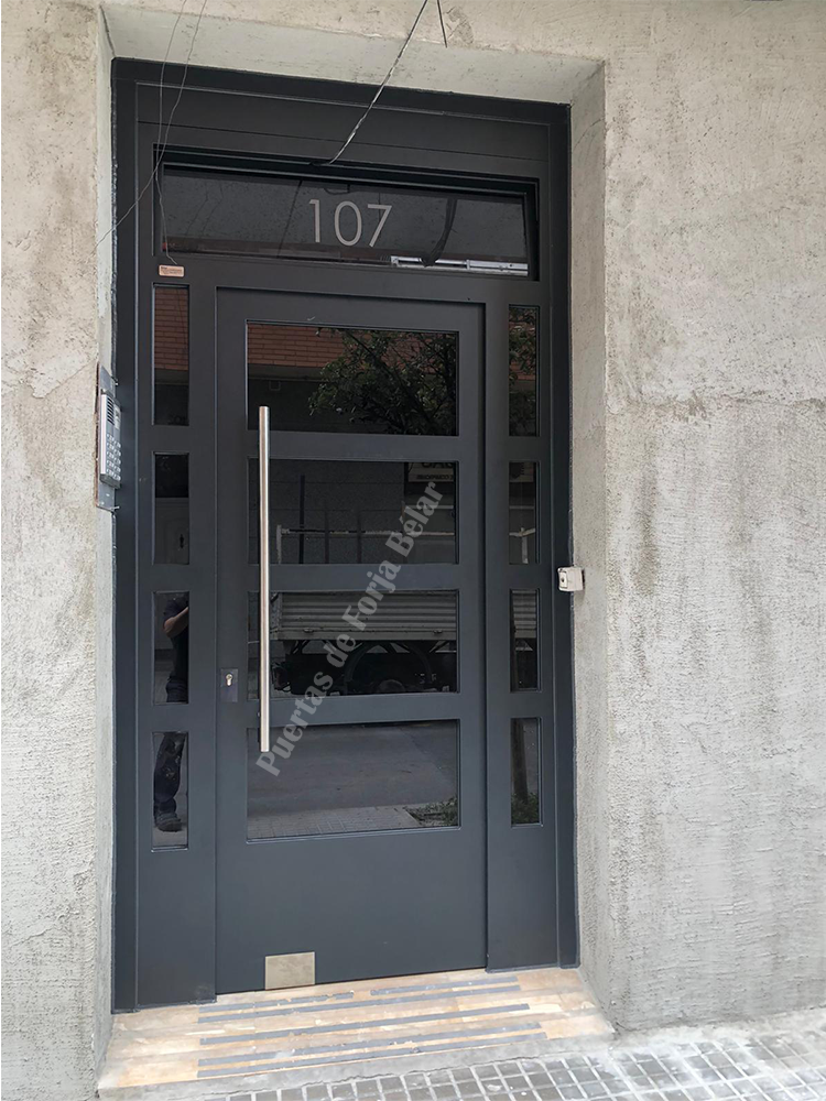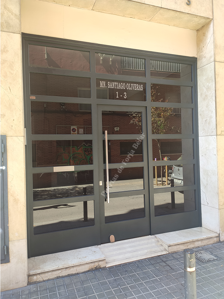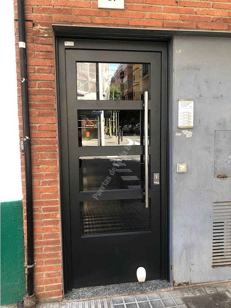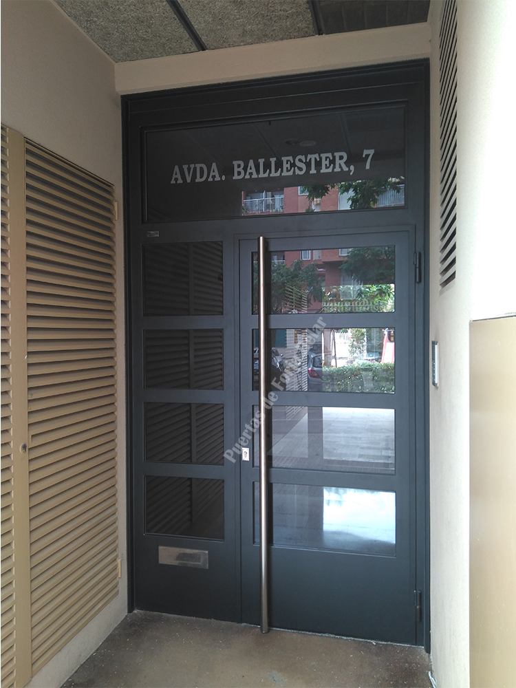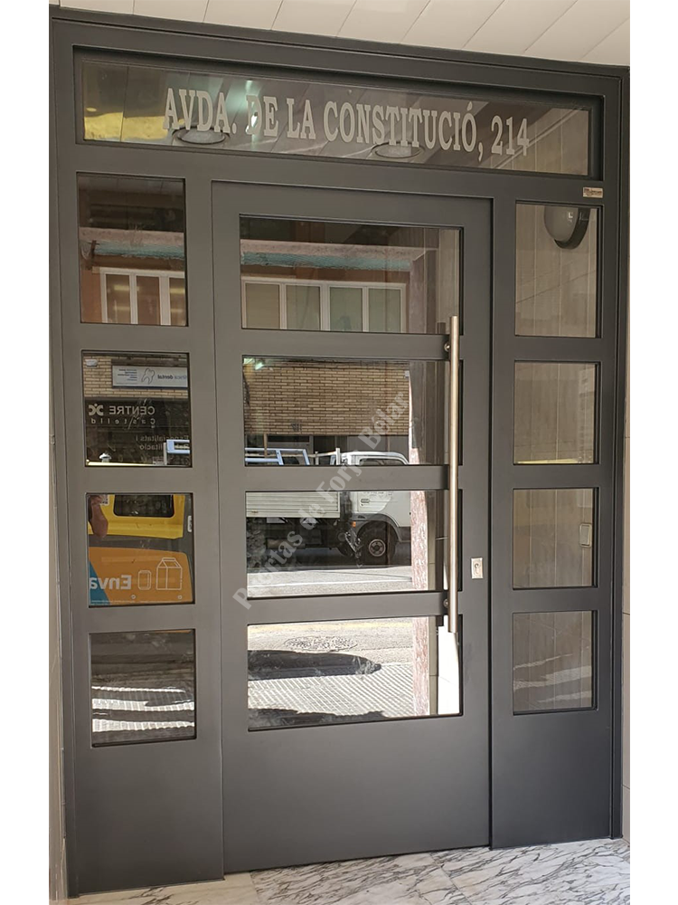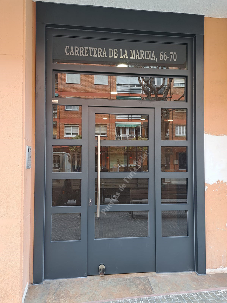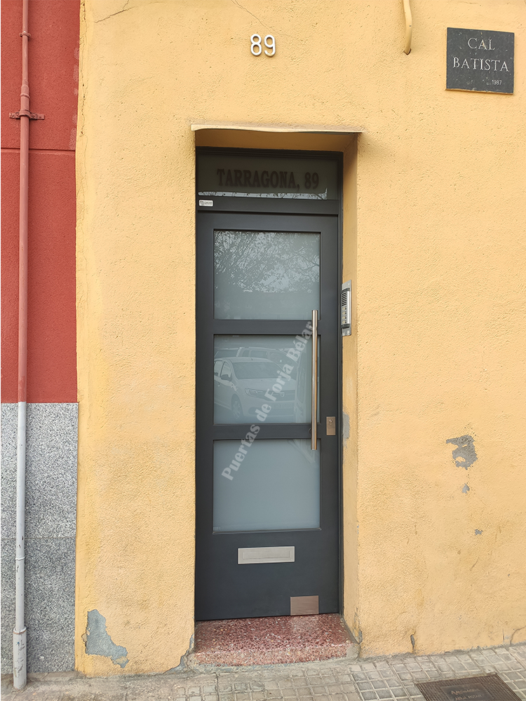 Puerta de comunidad de vecinos de estilo moderno, fabricada con hierro forjado que proporciona gran robustez y una elegancia exquisita. El acristalamiento proporciona mucha luminosidad al interior.