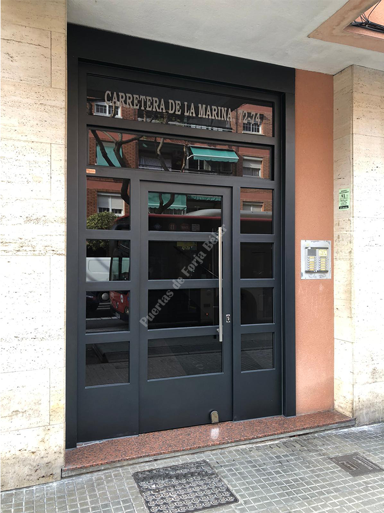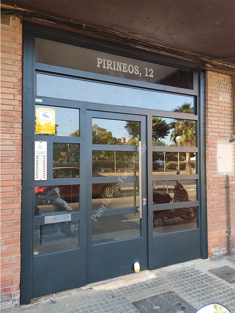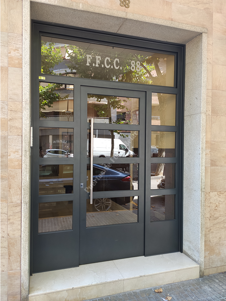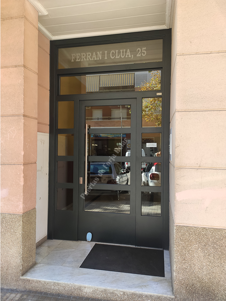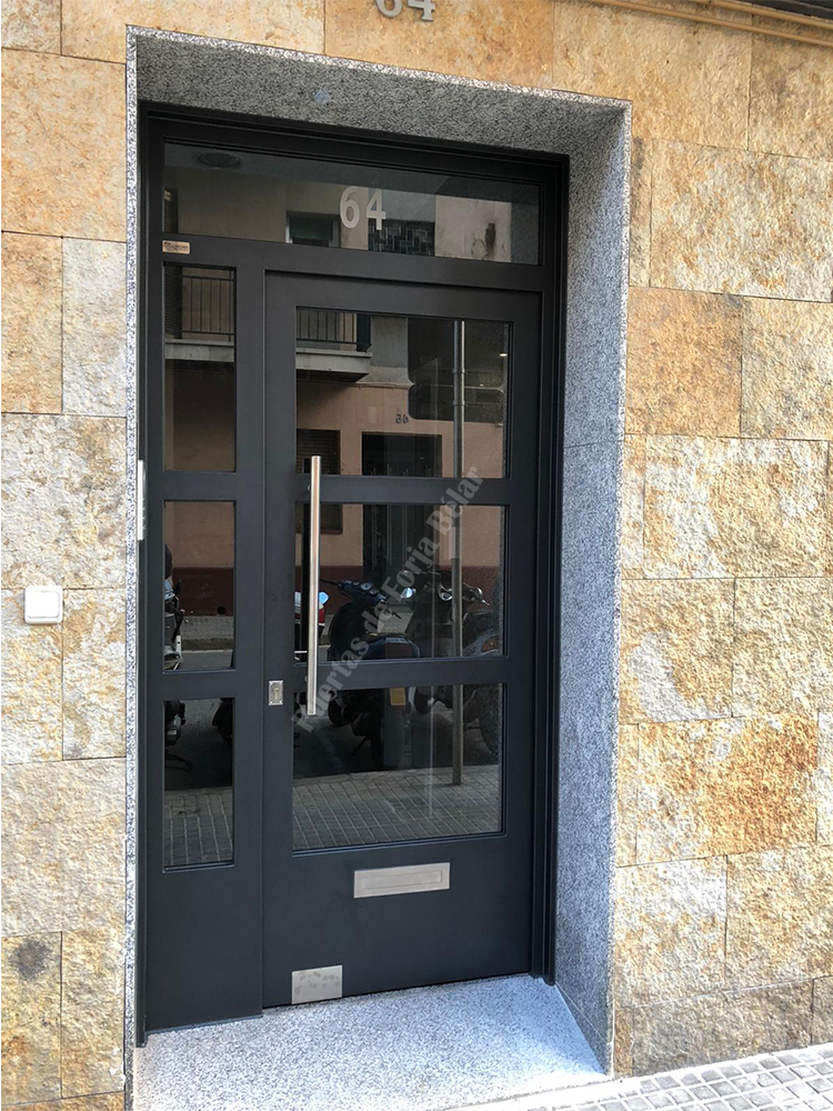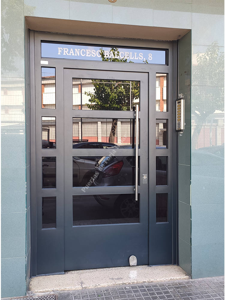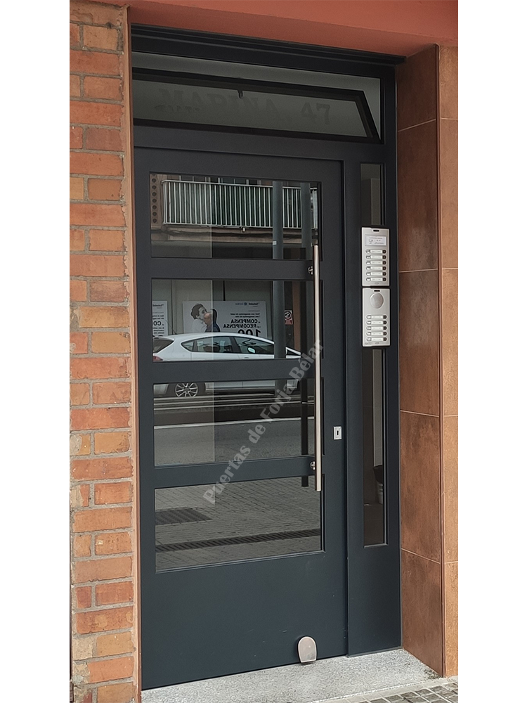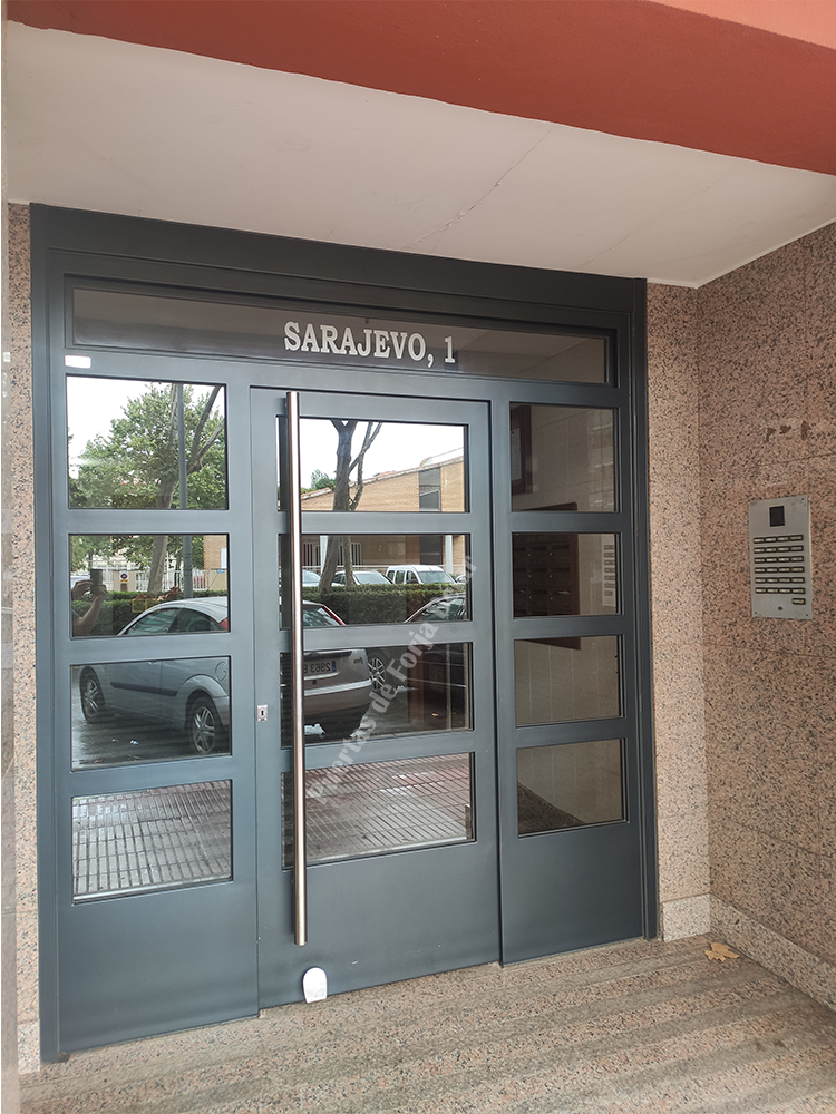 Puerta de comunidad de vecinos de estilo moderno, fabricada con hierro forjado que proporciona gran robustez y una elegancia exquisita. El acristalamiento proporciona mucha luminosidad al interior.