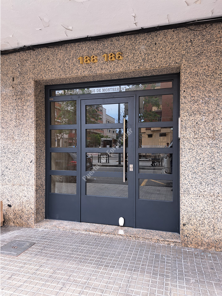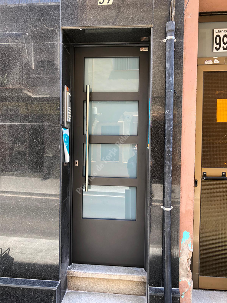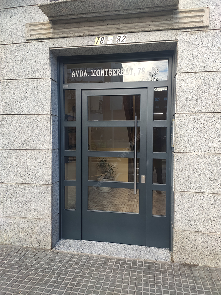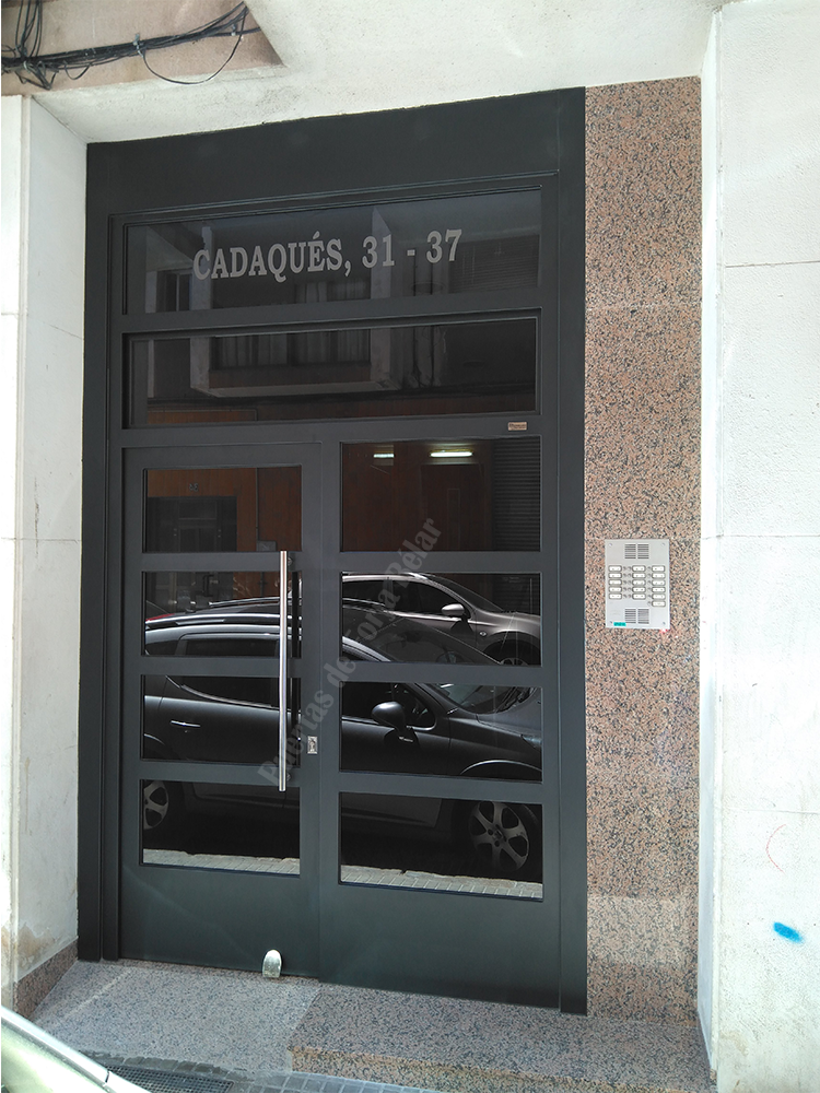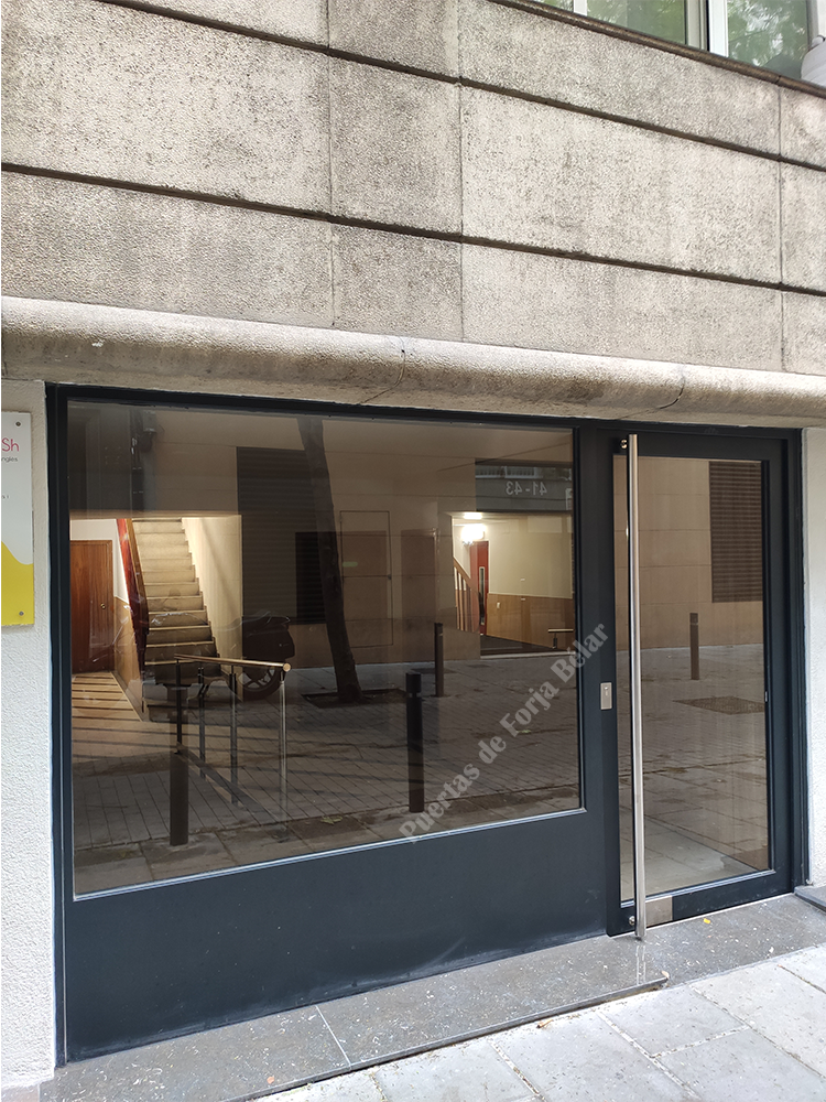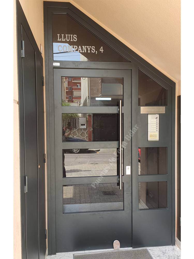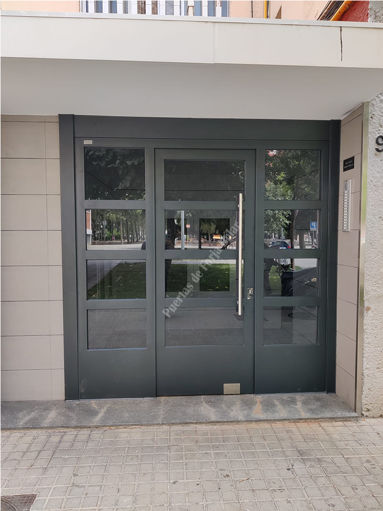 Puerta de comunidad de vecinos de estilo moderno, fabricada con hierro forjado que proporciona gran robustez y una elegancia exquisita. El acristalamiento proporciona mucha luminosidad al interior.