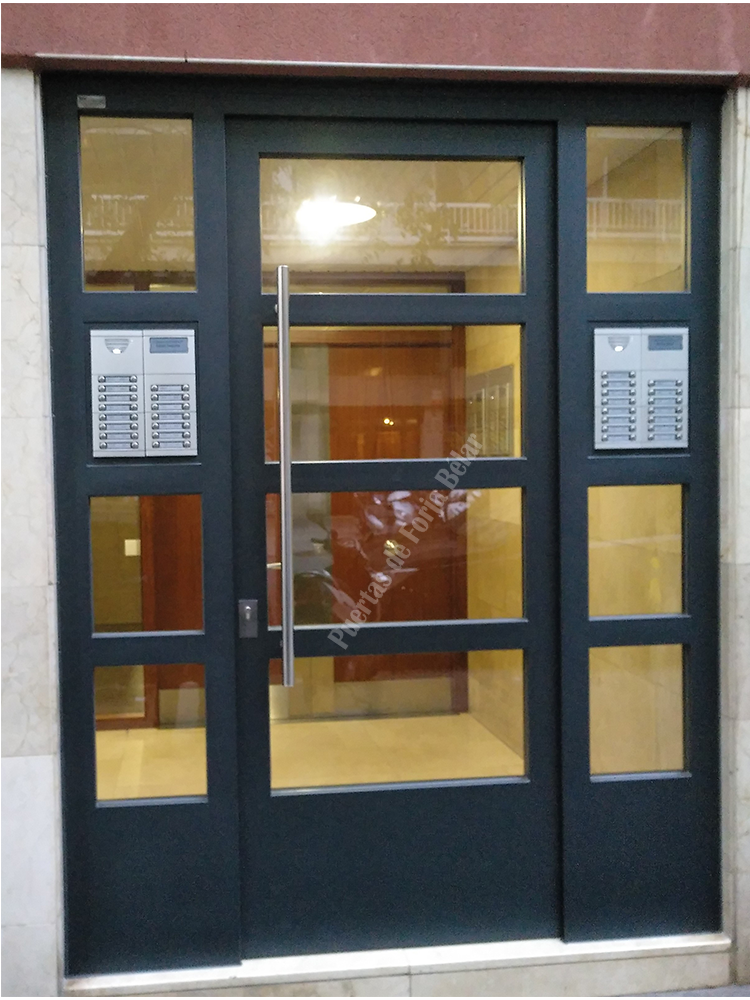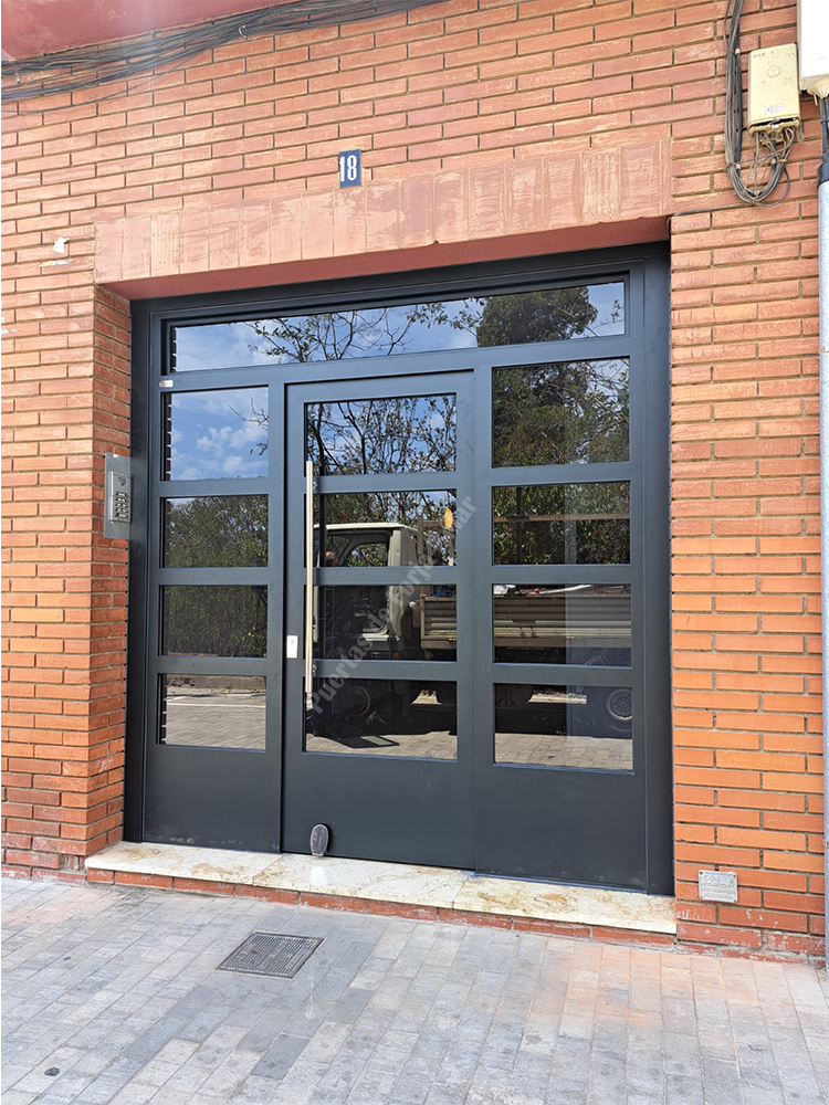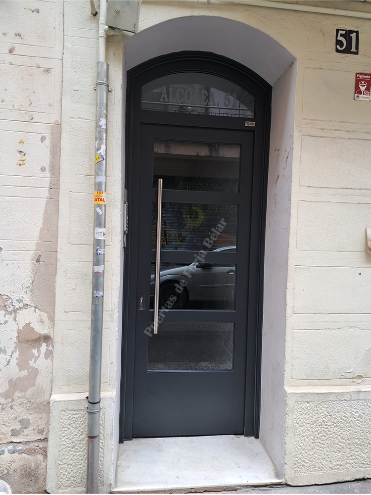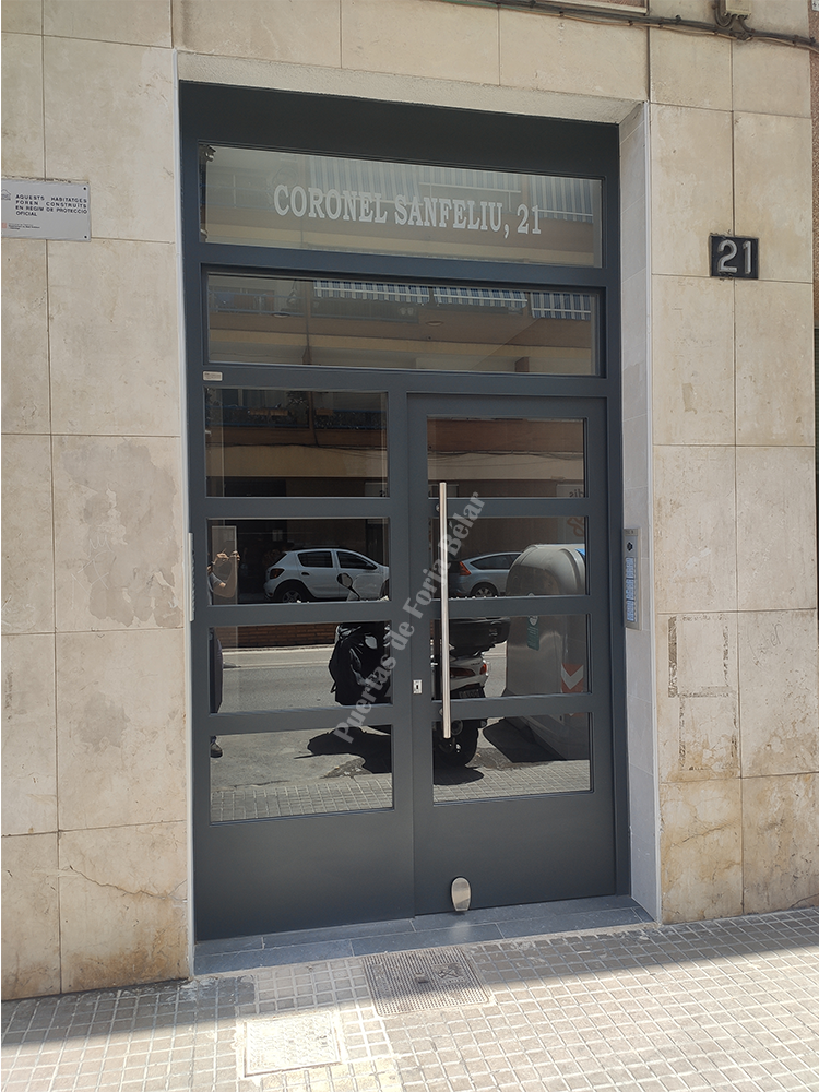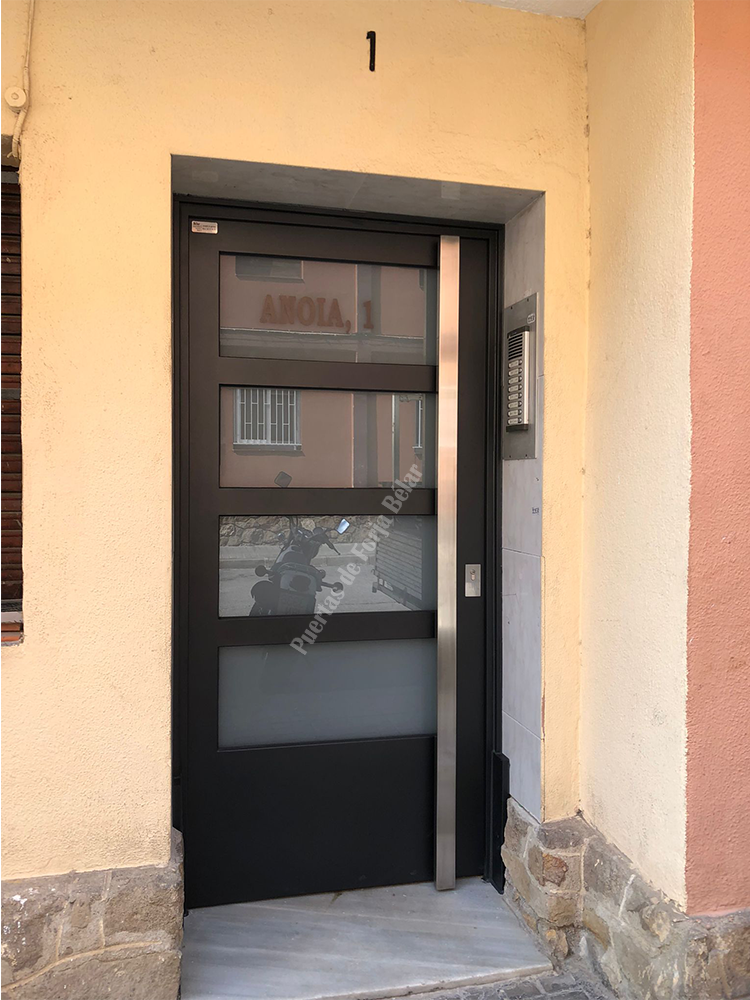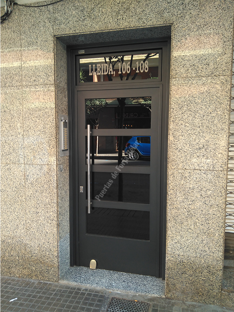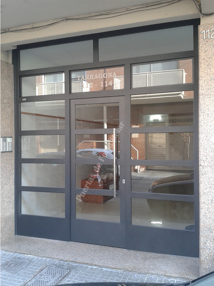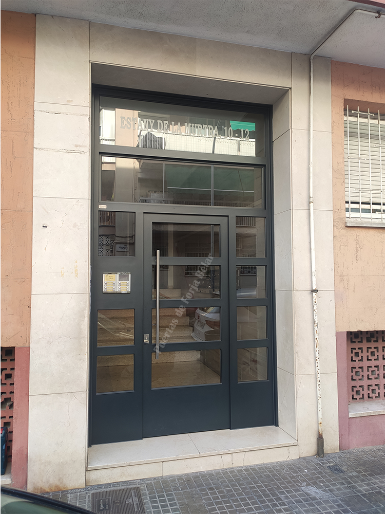 Puerta de comunidad de vecinos de estilo moderno, fabricada con hierro forjado que proporciona gran robustez y una elegancia exquisita. El acristalamiento proporciona mucha luminosidad al interior.