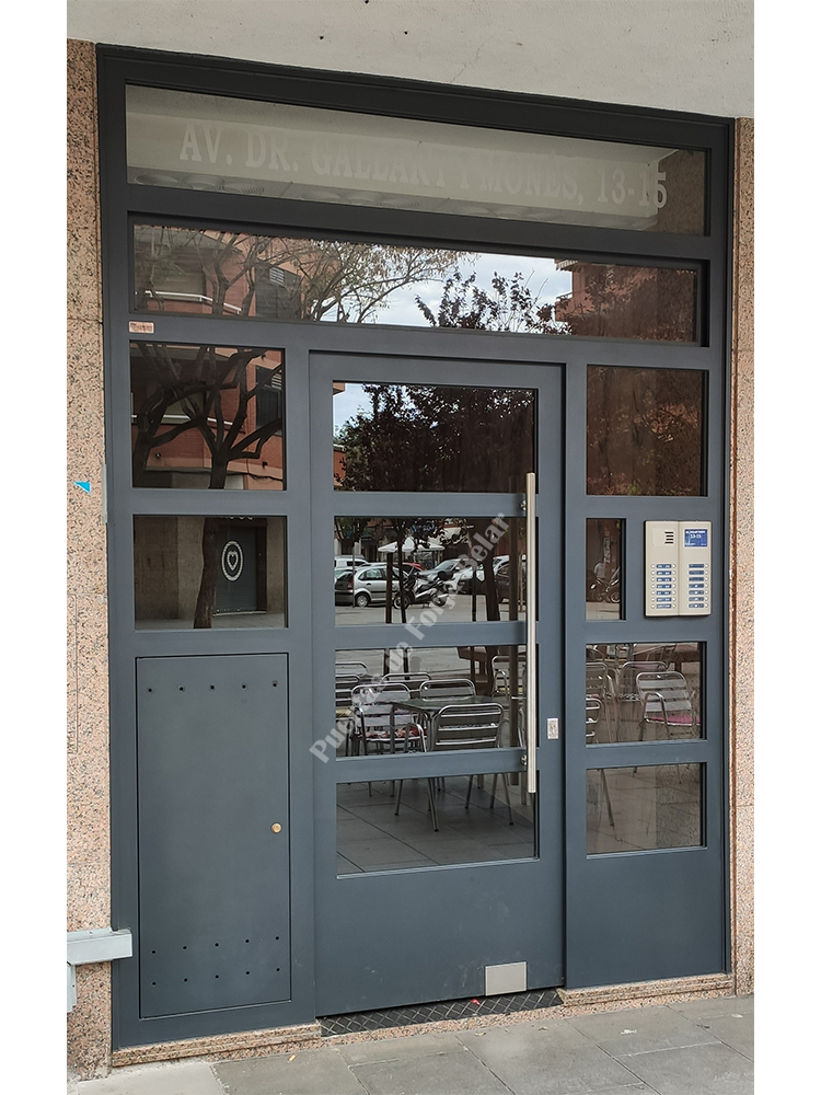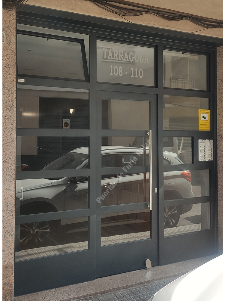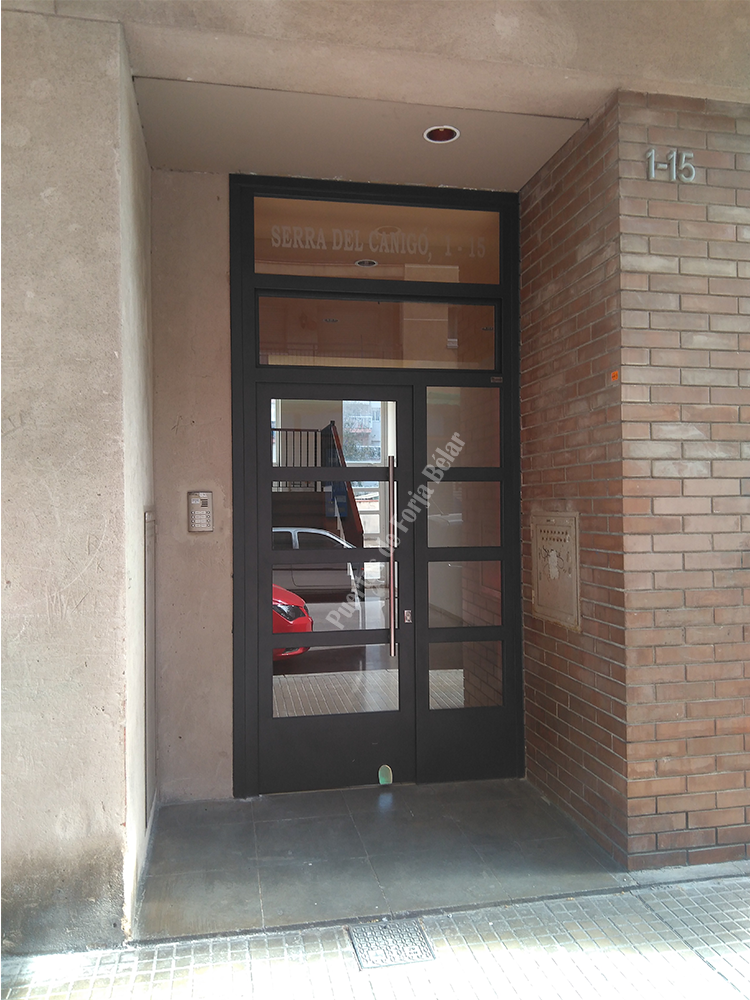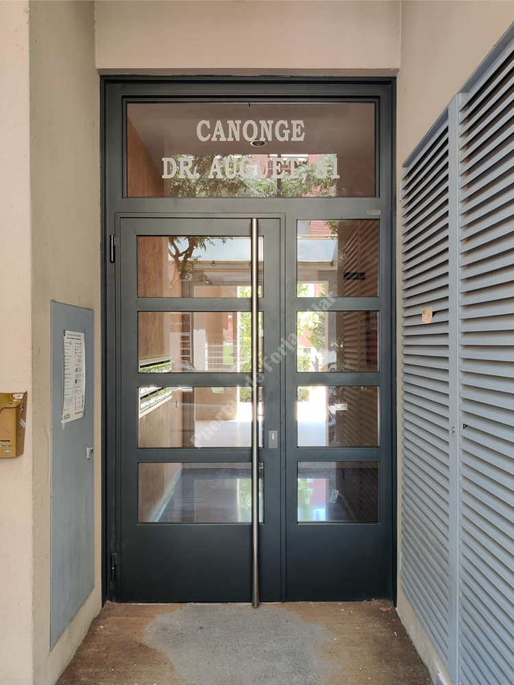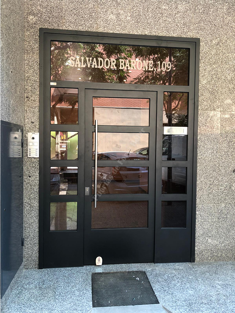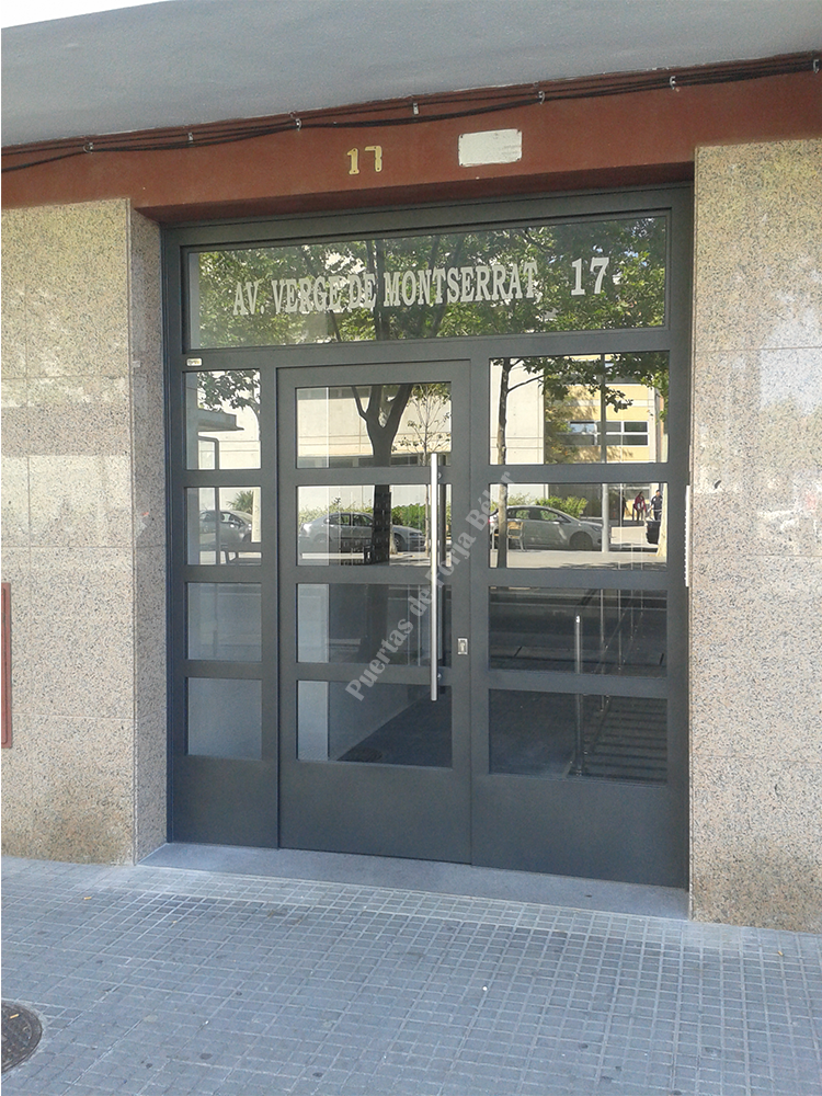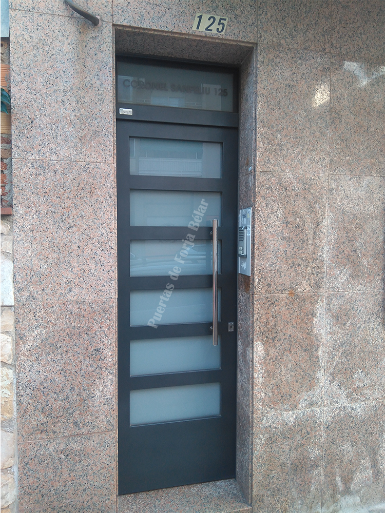 Puerta de comunidad de vecinos de estilo moderno, fabricada con hierro forjado que proporciona gran robustez y una elegancia exquisita. El acristalamiento proporciona mucha luminosidad al interior.