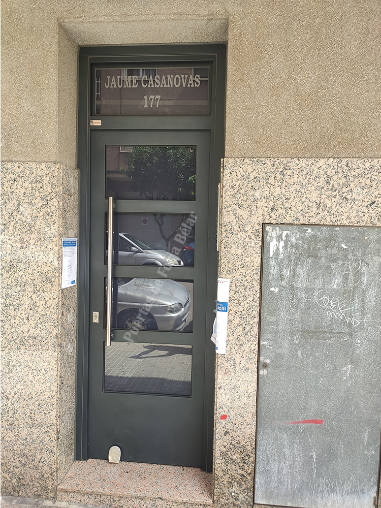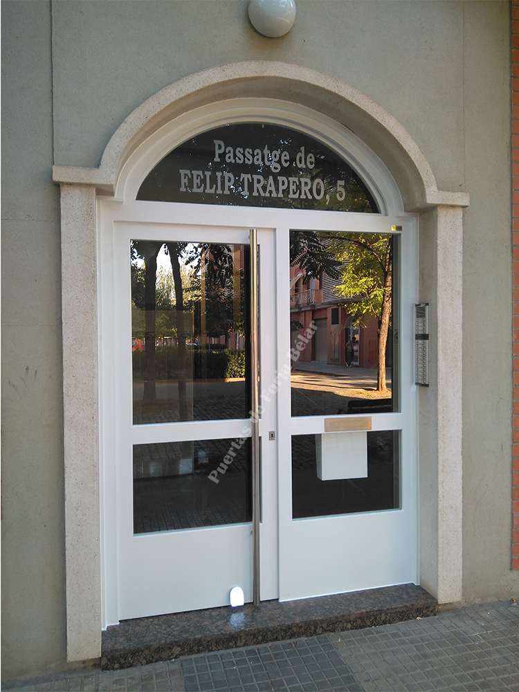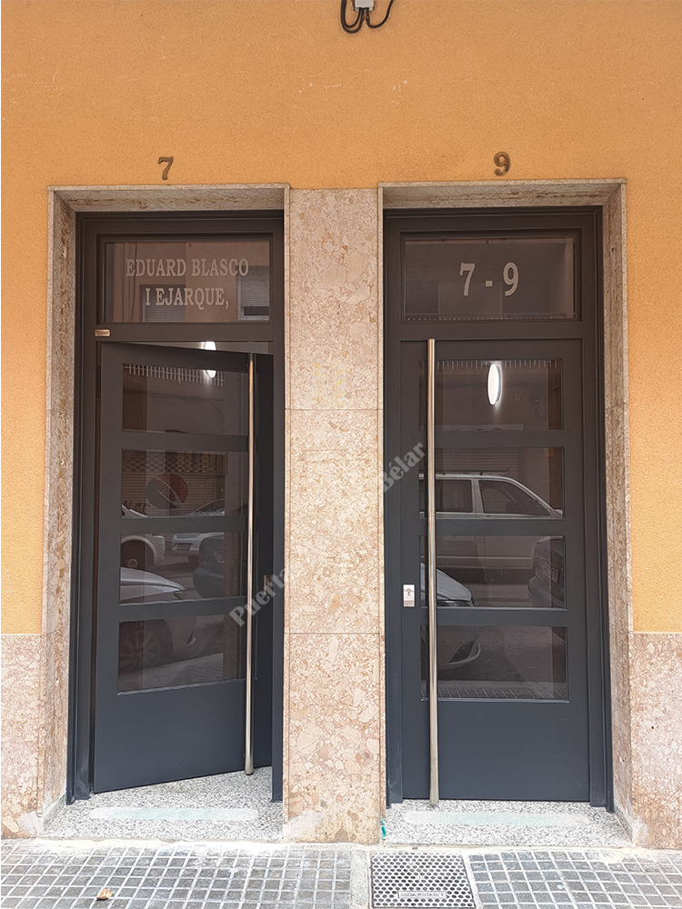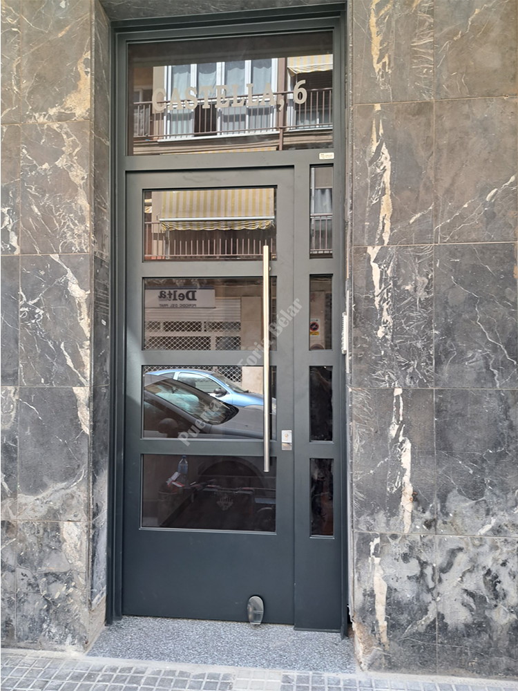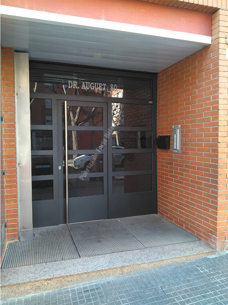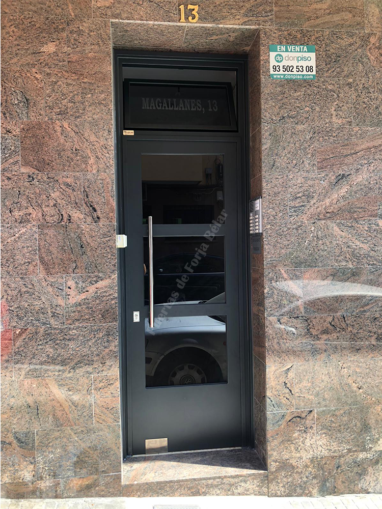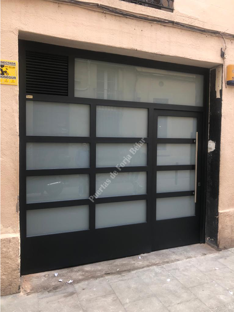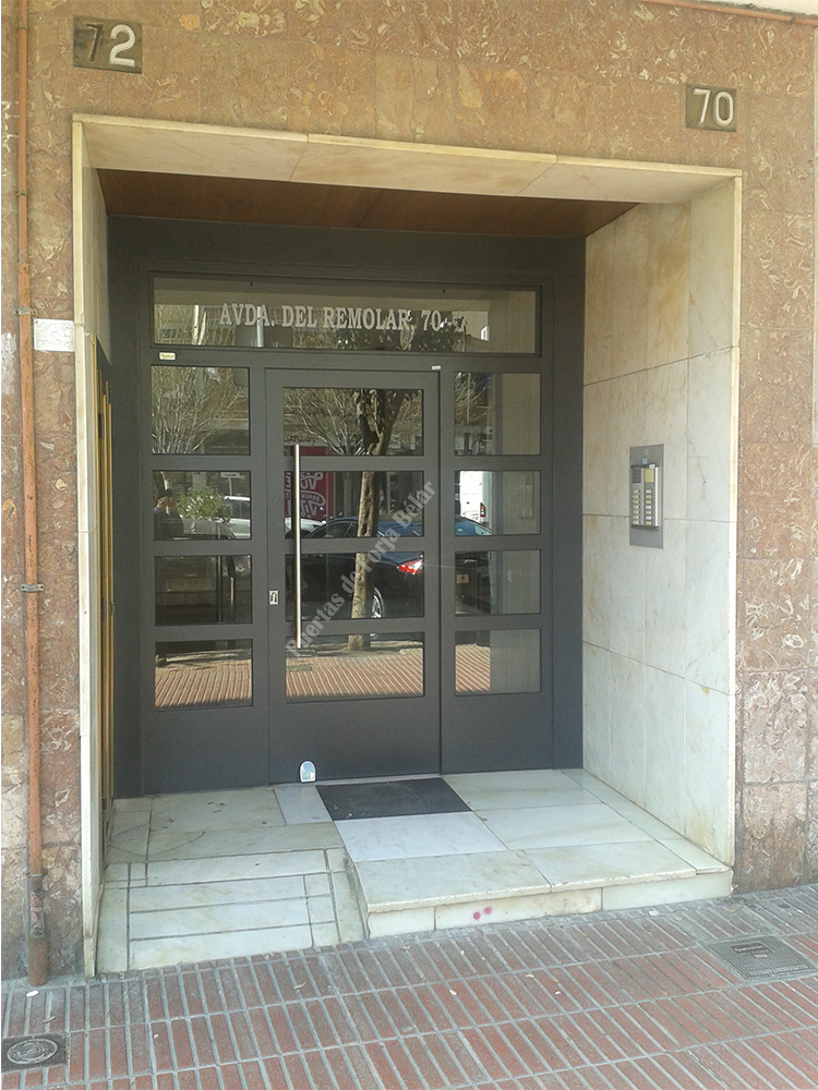 Puerta de comunidad de vecinos de estilo moderno, fabricada con hierro forjado que proporciona gran robustez y una elegancia exquisita. El acristalamiento proporciona mucha luminosidad al interior.