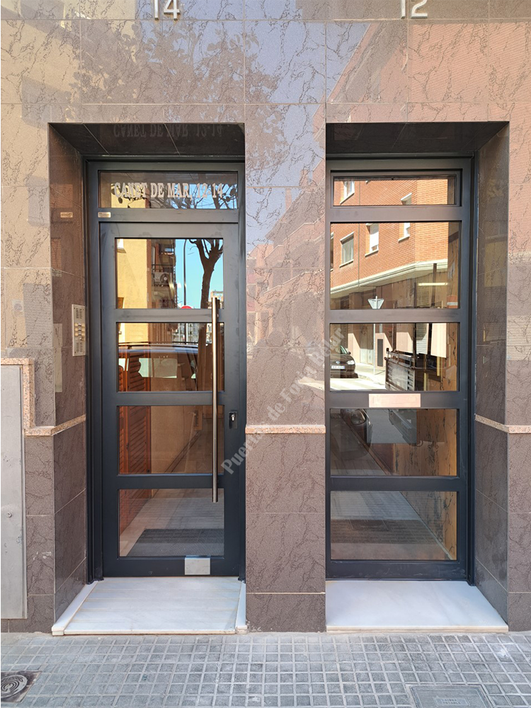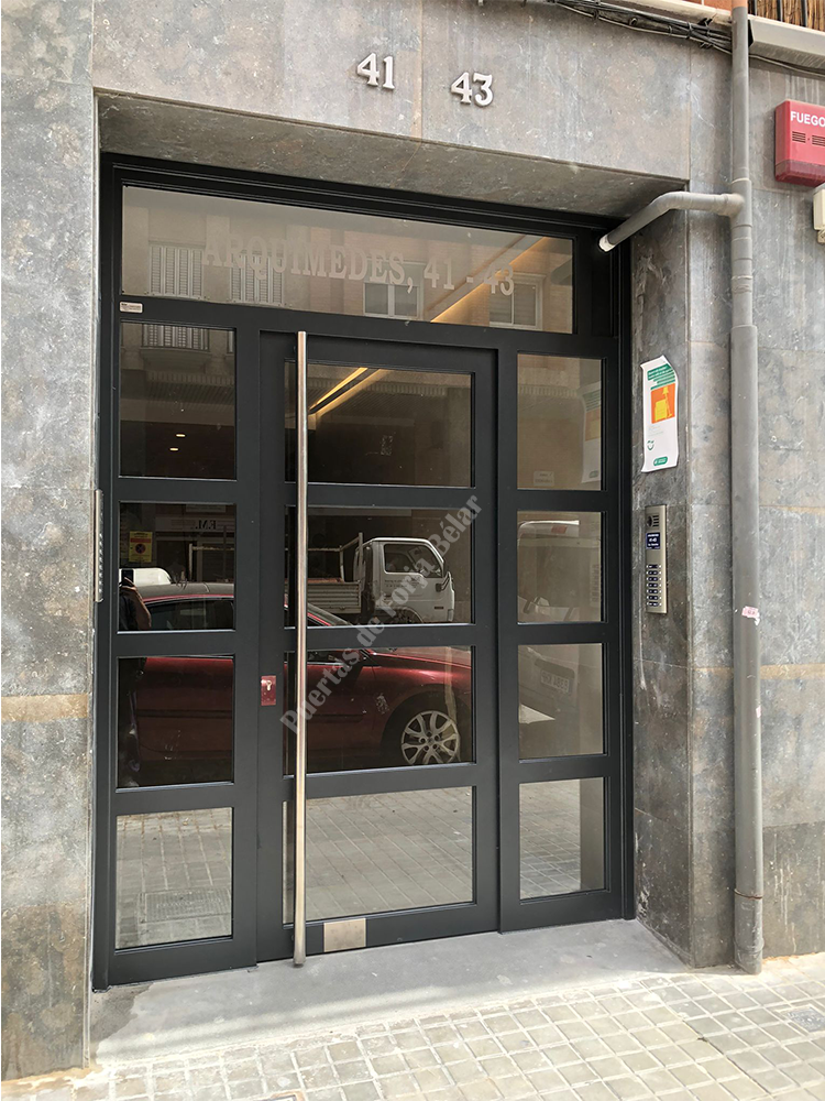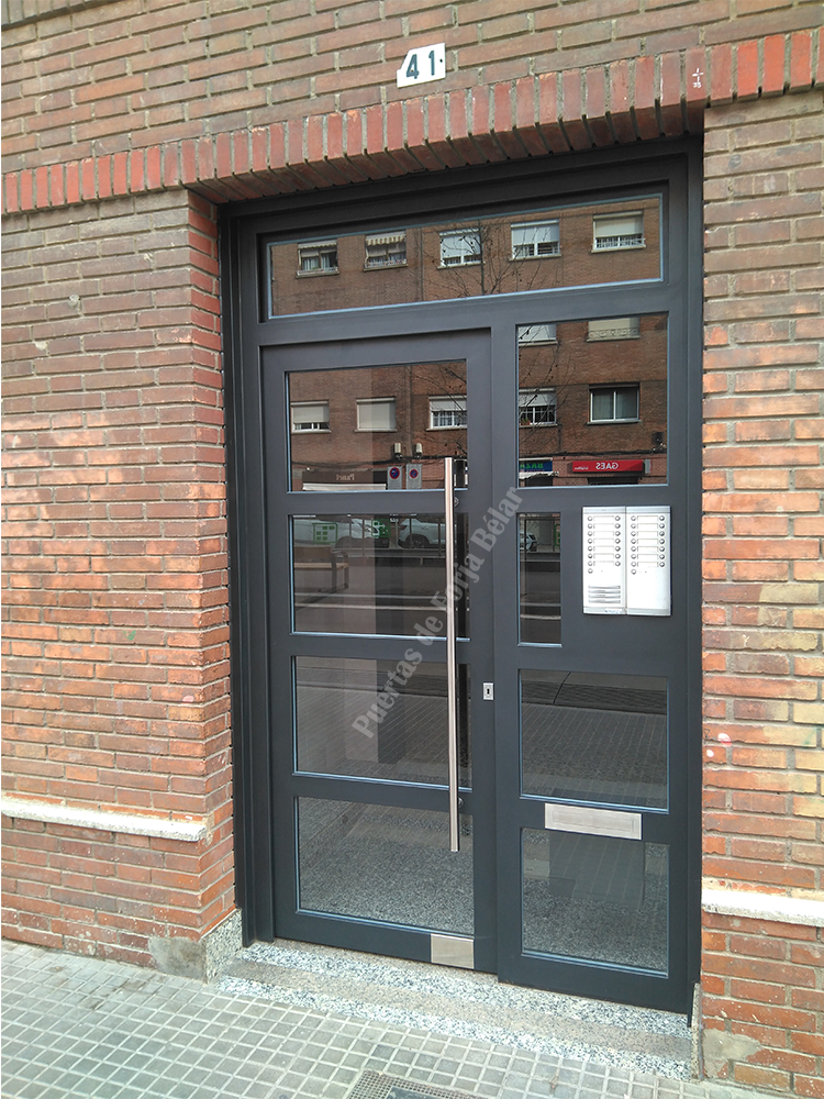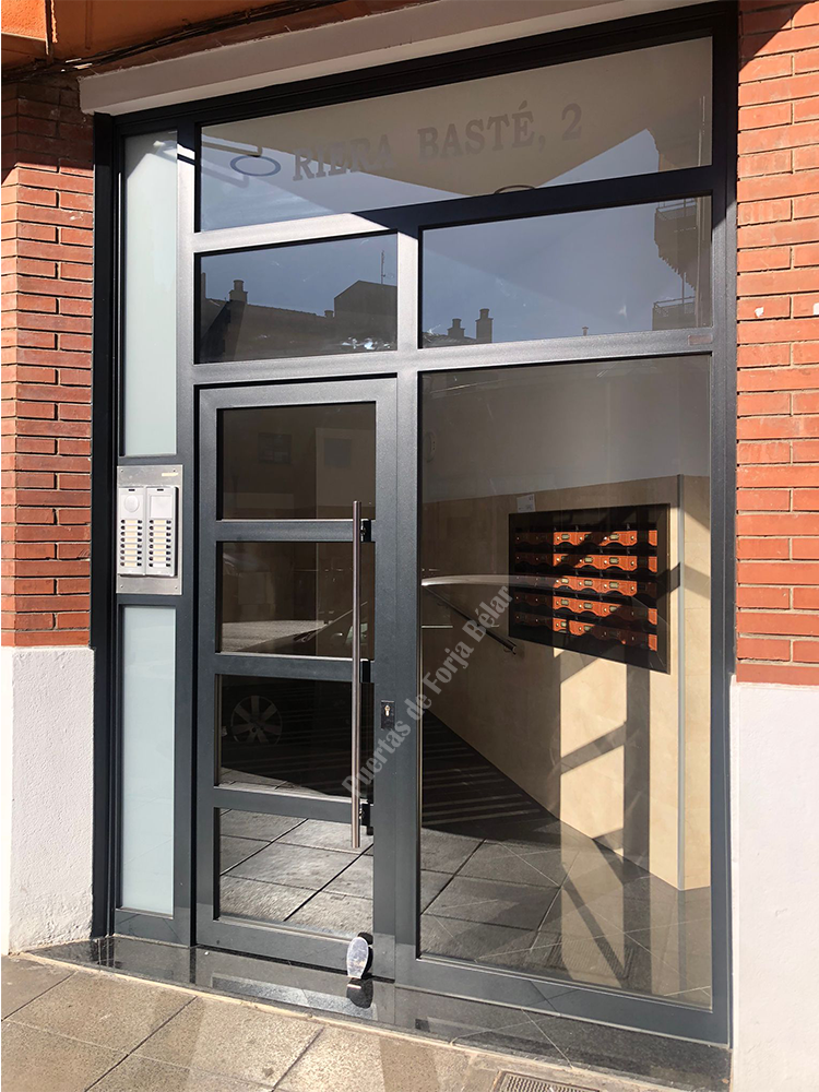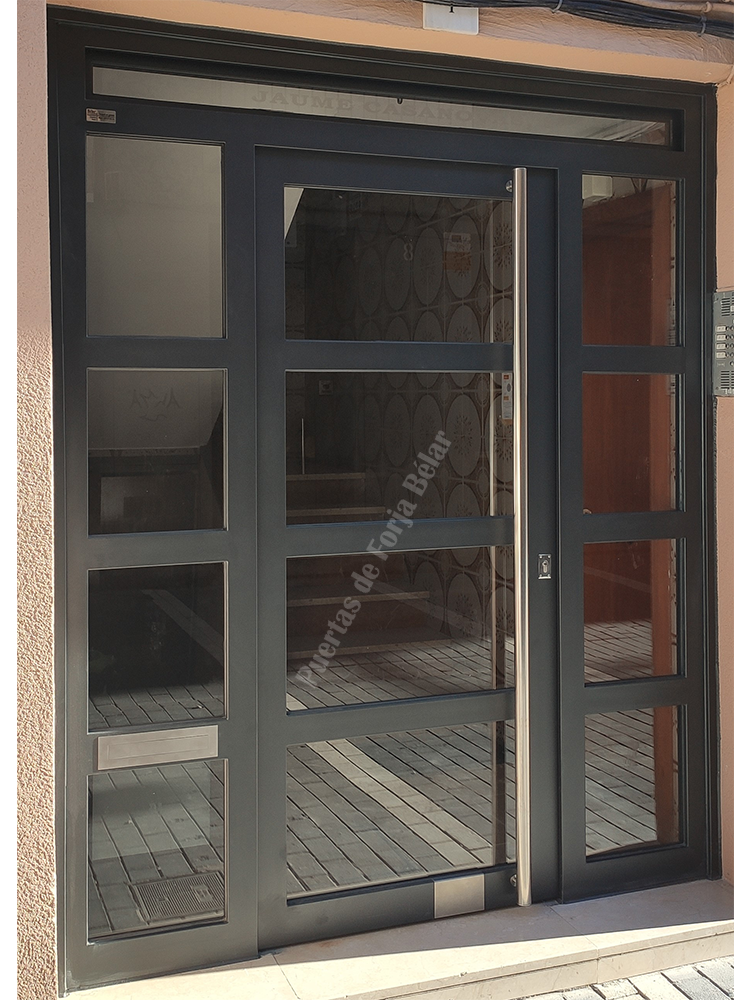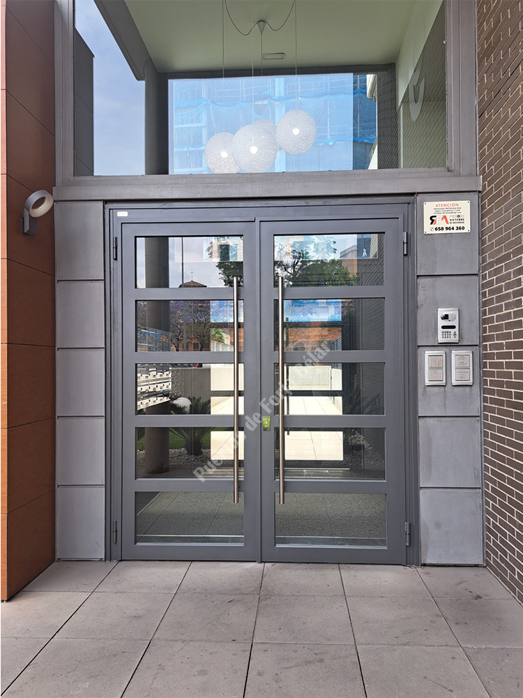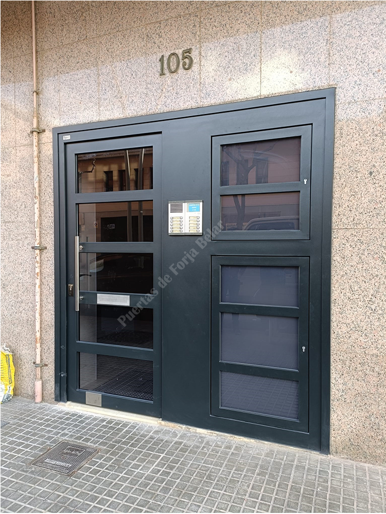 ​Puerta de comunidad de vecinos de estilo moderno, fabricada con hierro forjado que proporciona gran robustez y una elegancia exquisita. El acristalamiento proporciona mucha luminosidad al interior.