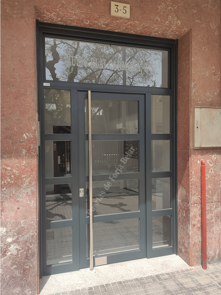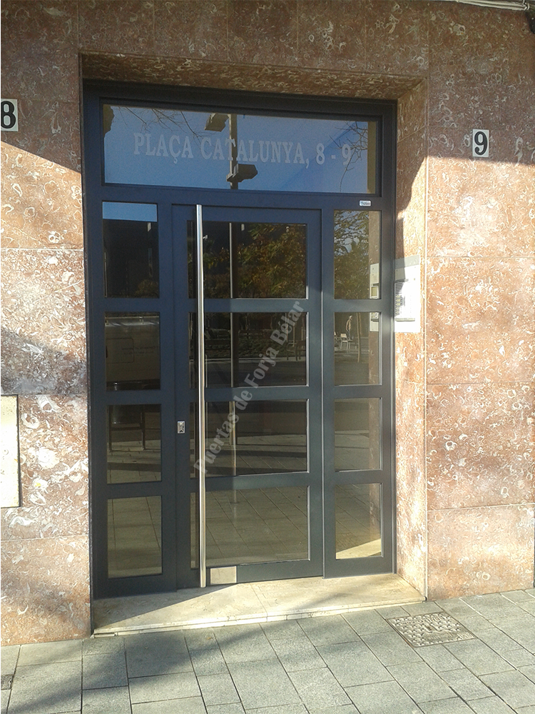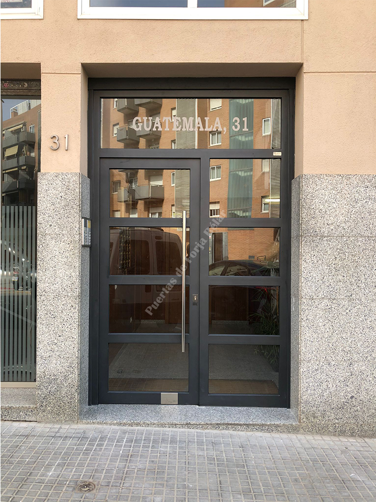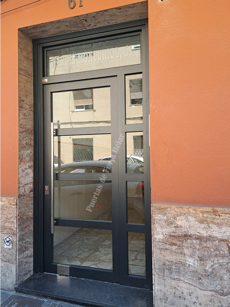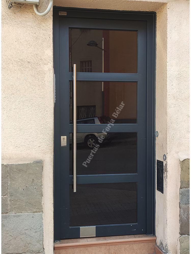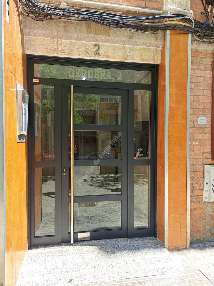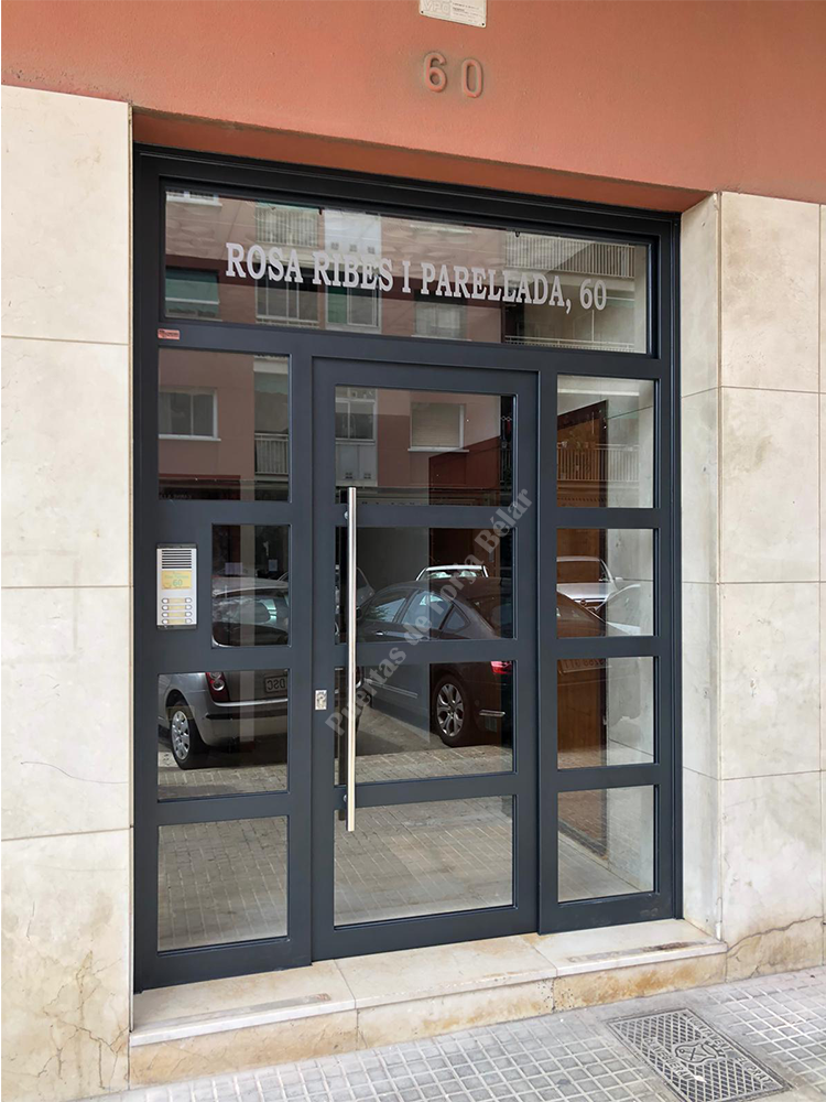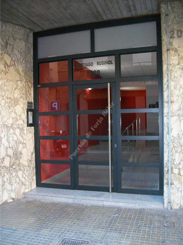​Puerta de comunidad de vecinos de estilo moderno, fabricada con hierro forjado que proporciona gran robustez y una elegancia exquisita. El acristalamiento proporciona mucha luminosidad al interior.