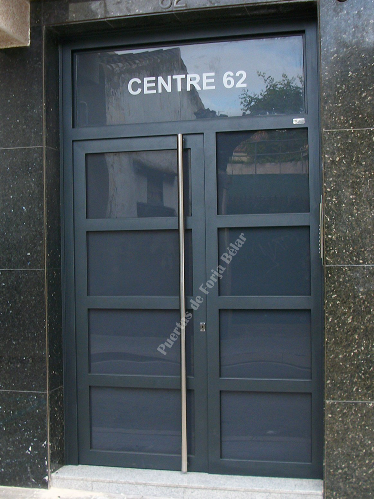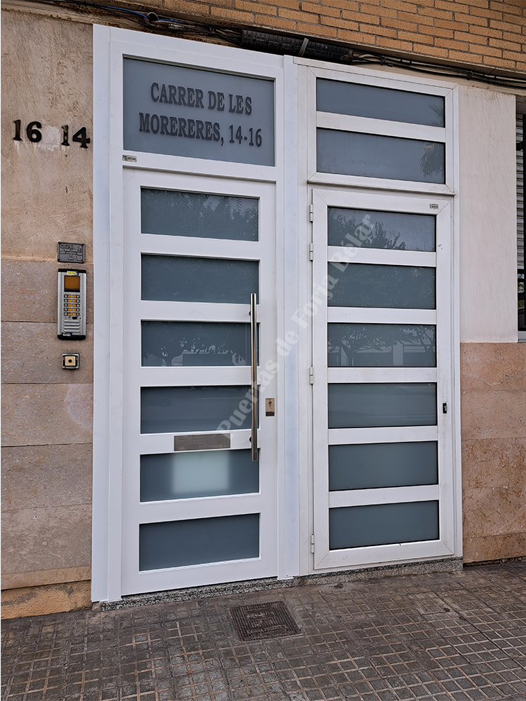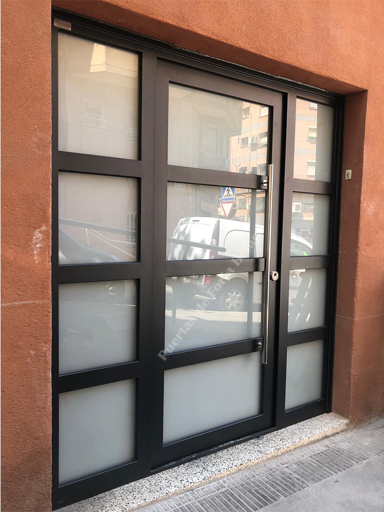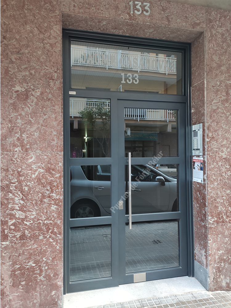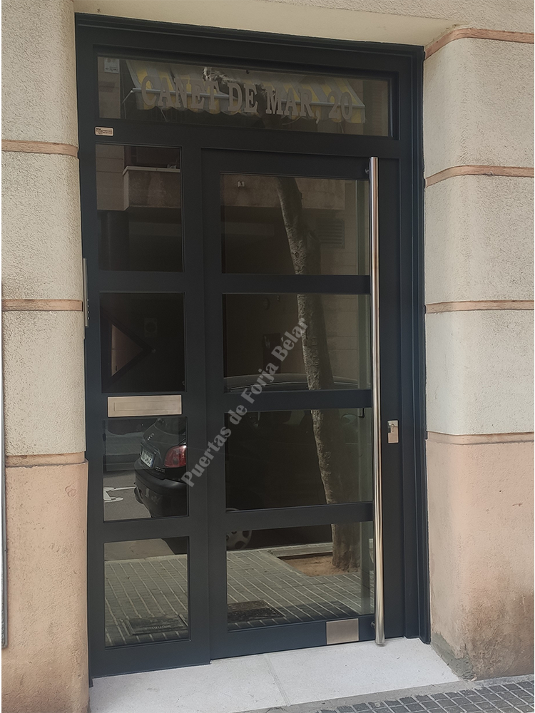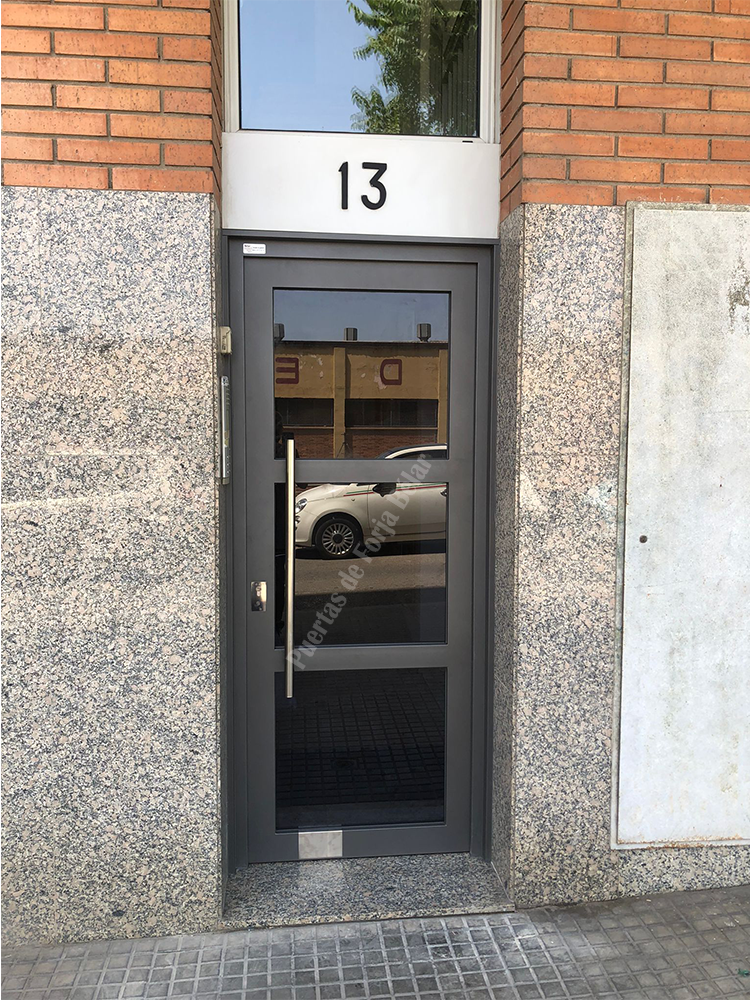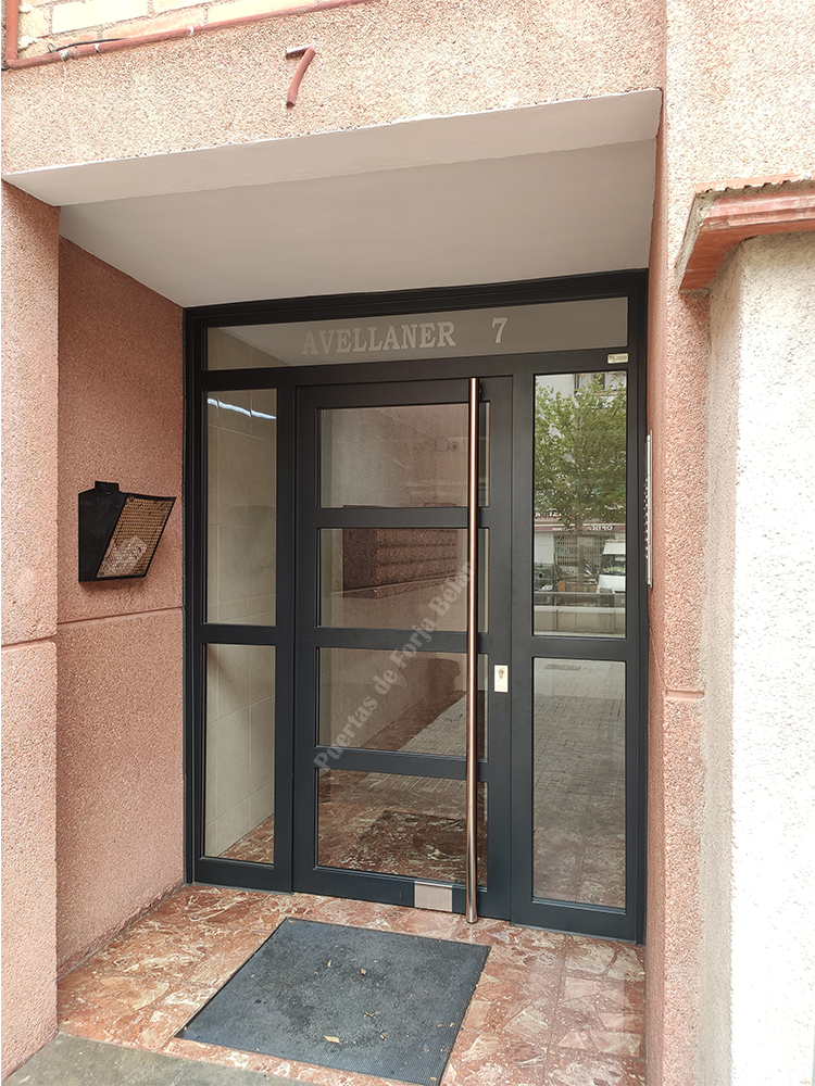 ​Puerta de comunidad de vecinos de estilo moderno, fabricada con hierro forjado que proporciona gran robustez y una elegancia exquisita. El acristalamiento proporciona mucha luminosidad al interior.