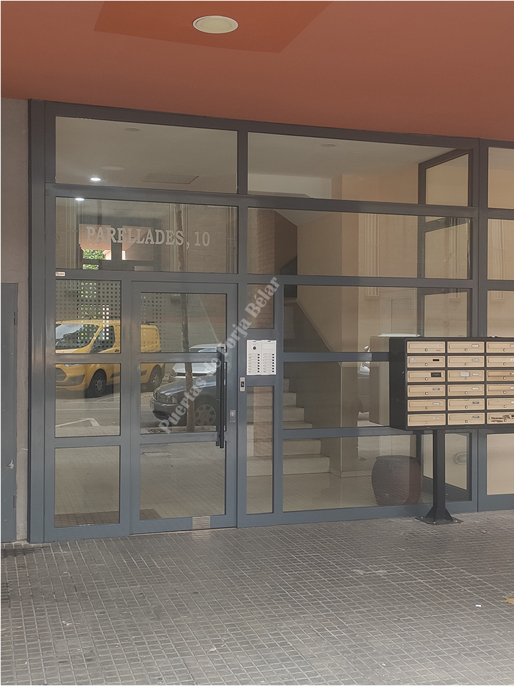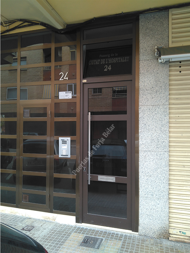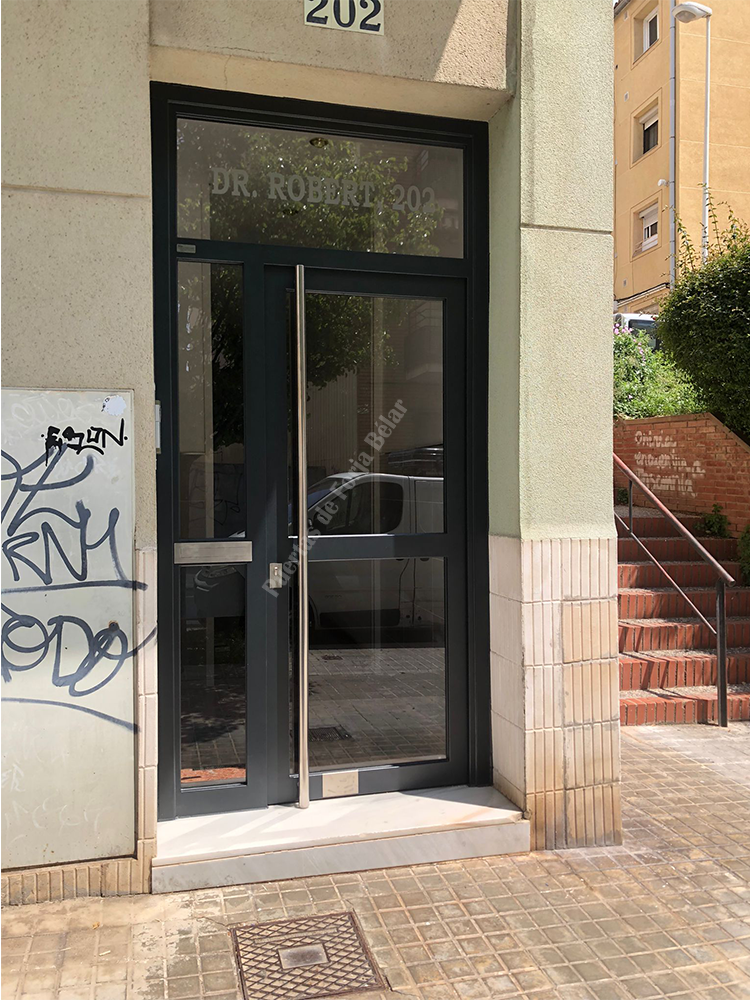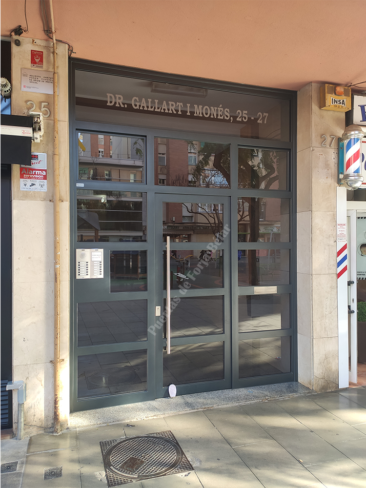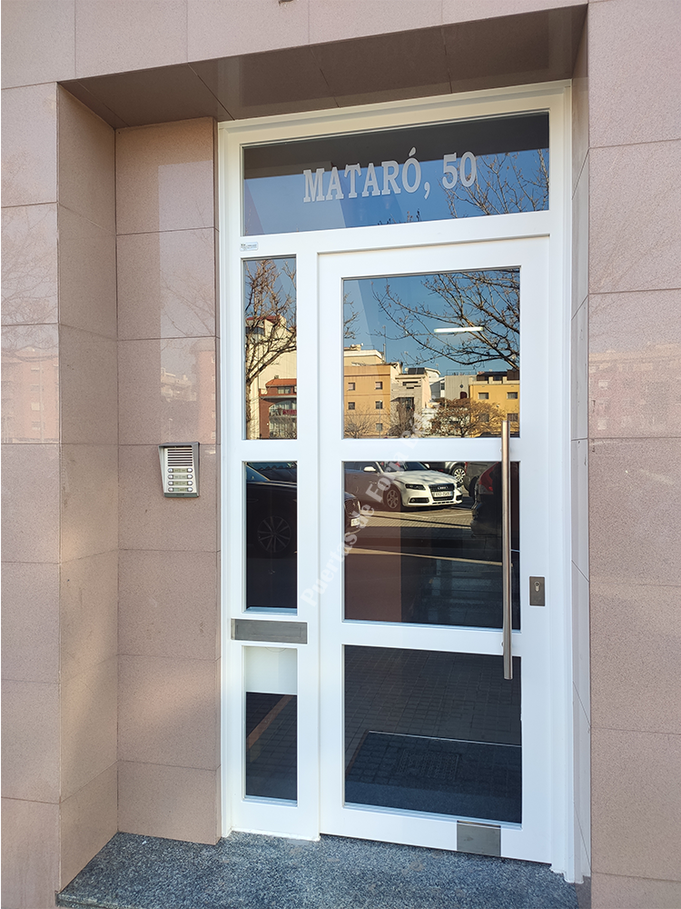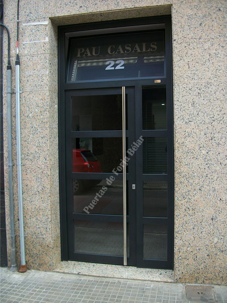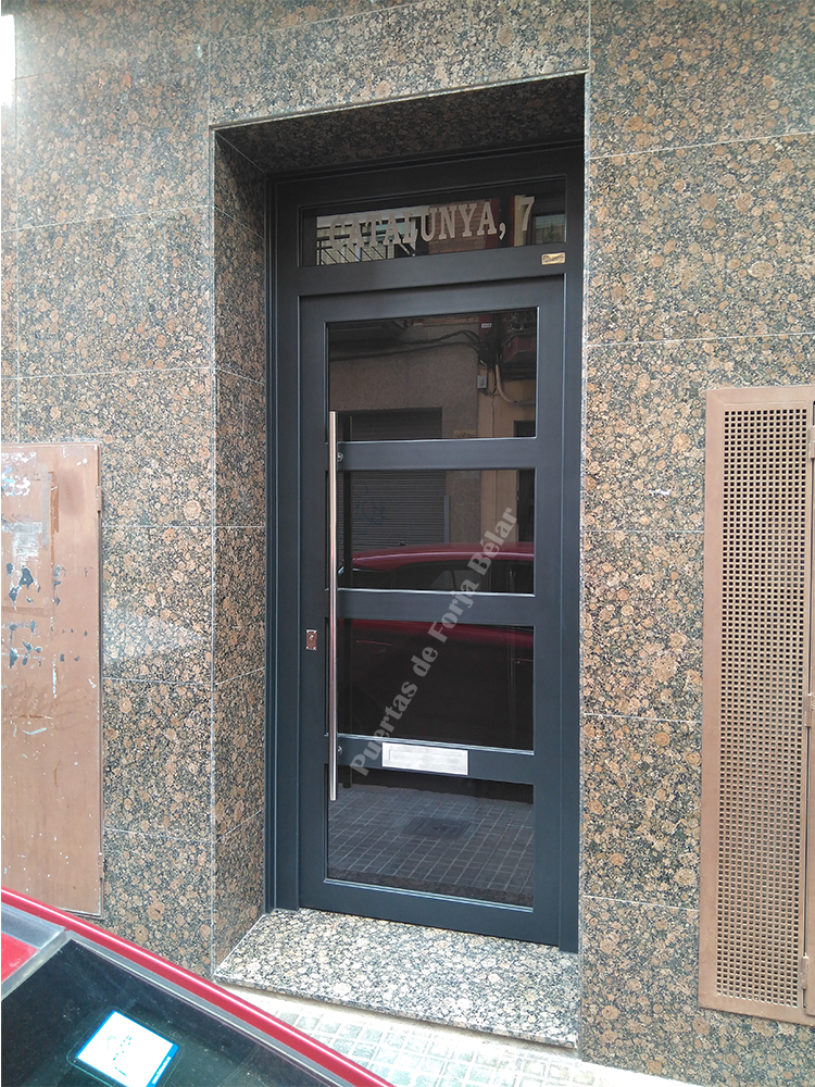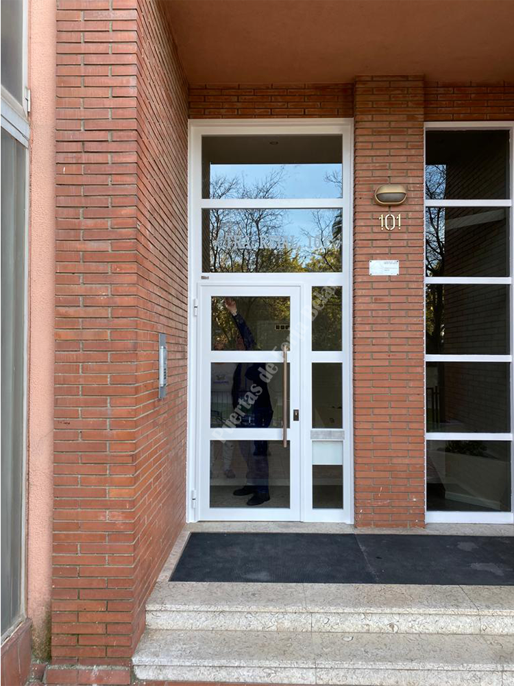 ​Puerta de comunidad de vecinos de estilo moderno, fabricada con hierro forjado que proporciona gran robustez y una elegancia exquisita. El acristalamiento proporciona mucha luminosidad al interior.
